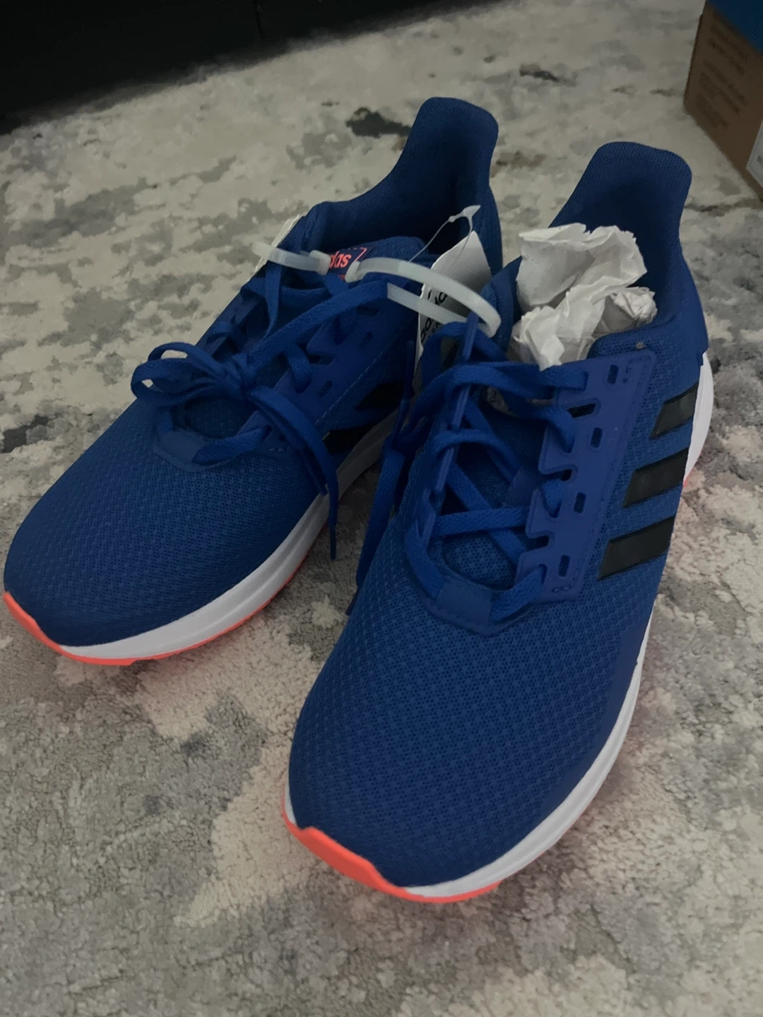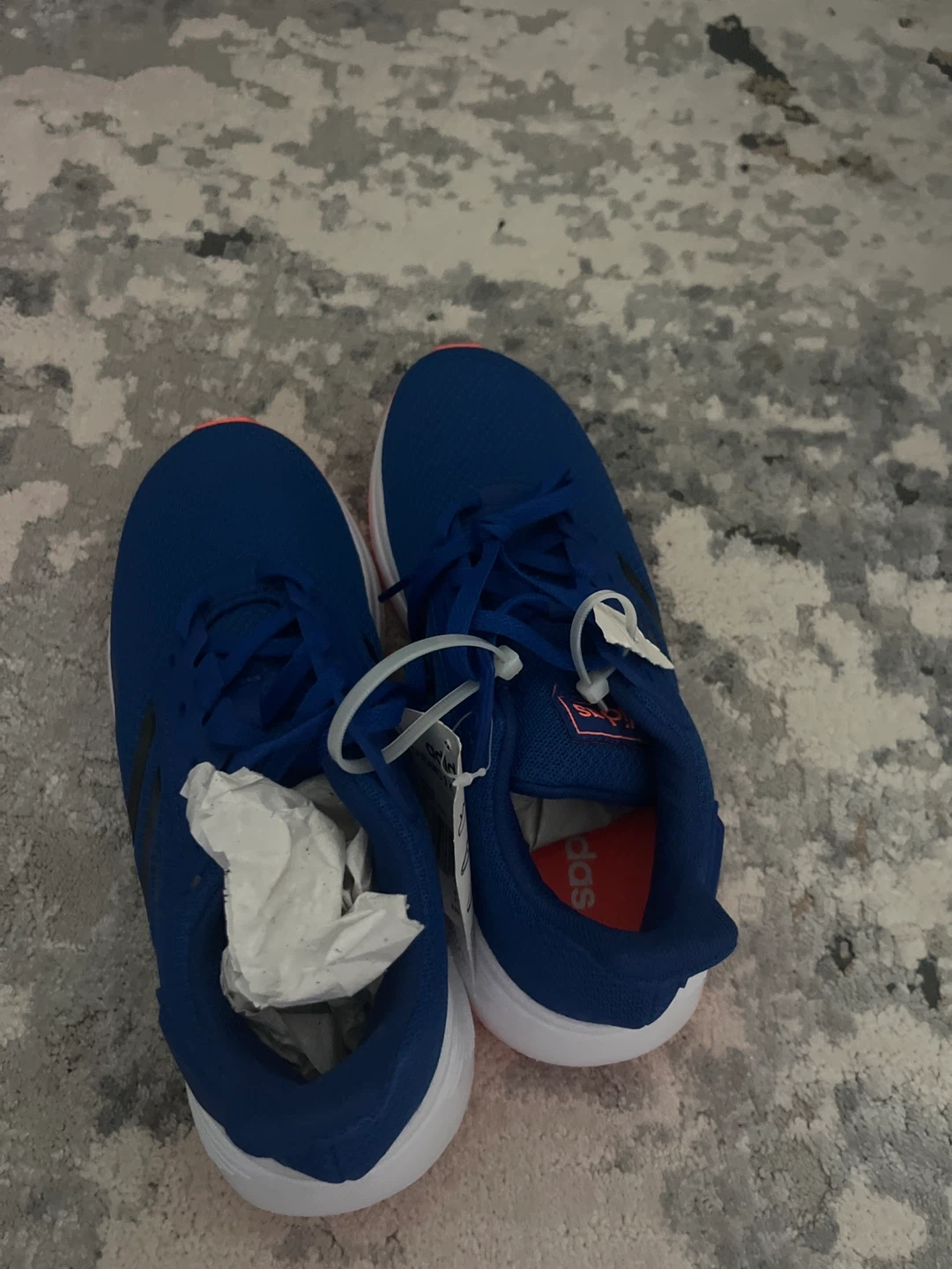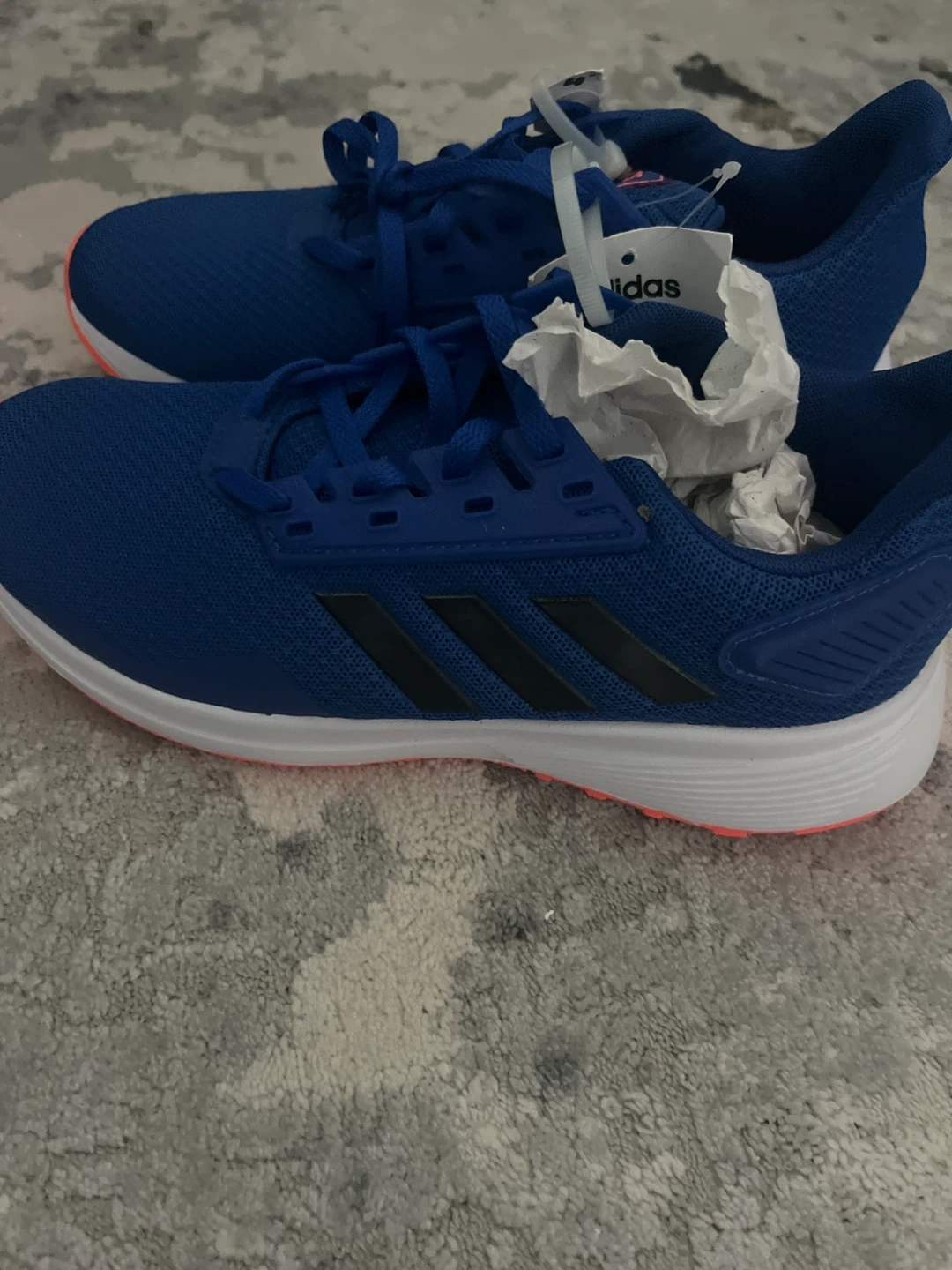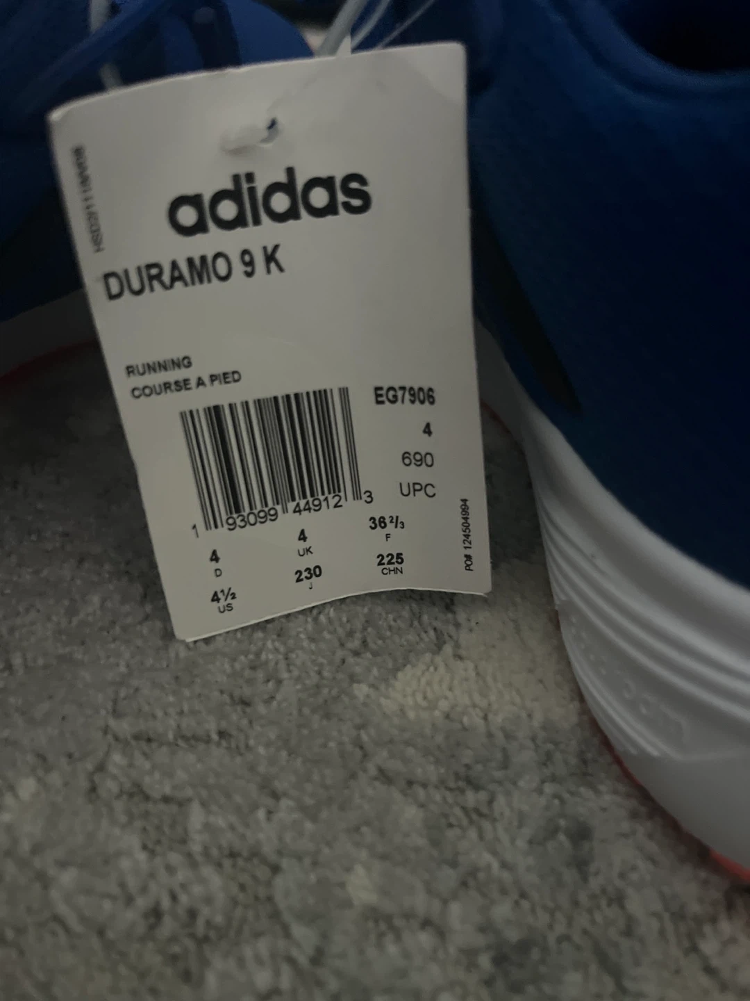 Blue Adidas Duramo 9K running shoes. Size 4 UK / 4.5 US. These shoes are in new condition with tags attached.