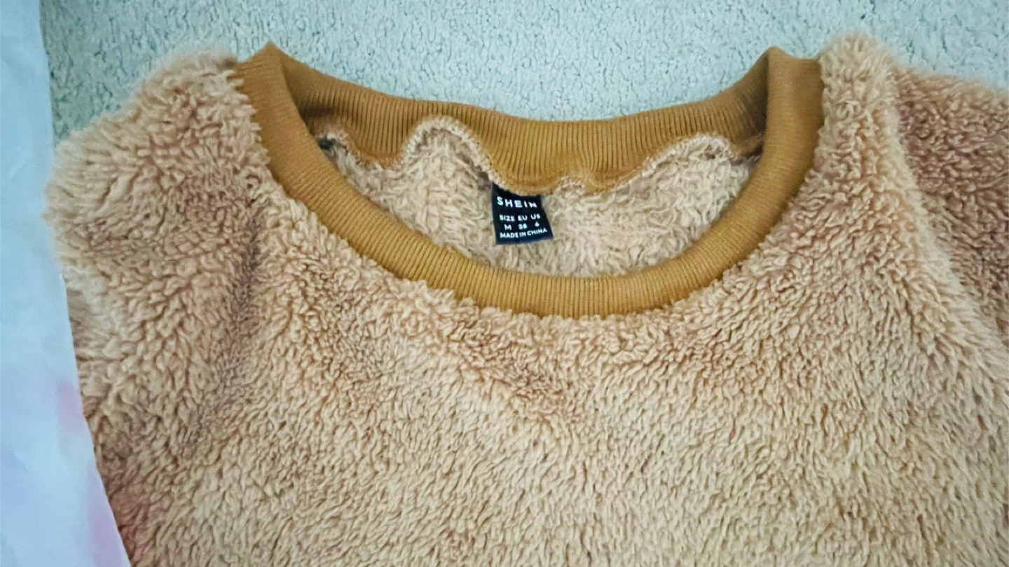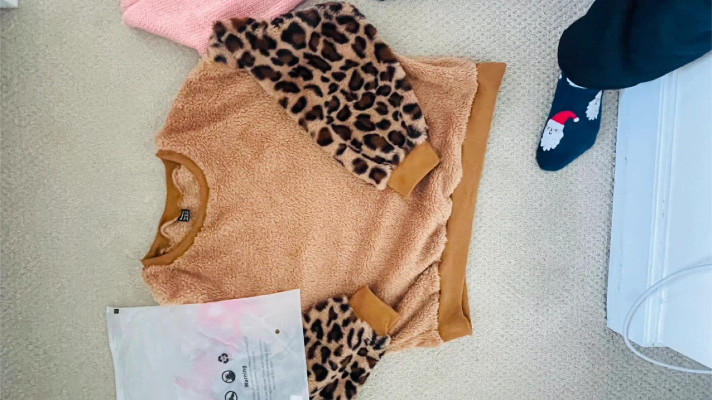 A few sweaters for sale! There is a fluffy brown Shein sweater with leopard print sleeves, a pink sweater with flower details, and a black Dazy sweater with a woman's face on it. All are size M