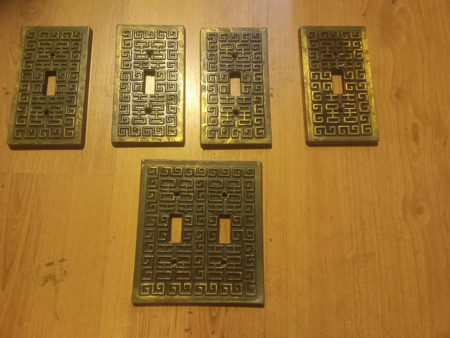 Set of five decorative light switch and outlet plates. Features a repeating geometric pattern with a brass or gold-tone finish. Includes four single-gang and one double-gang plate.
