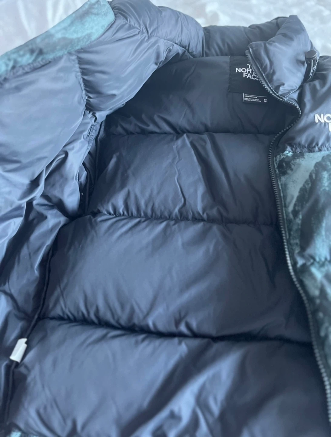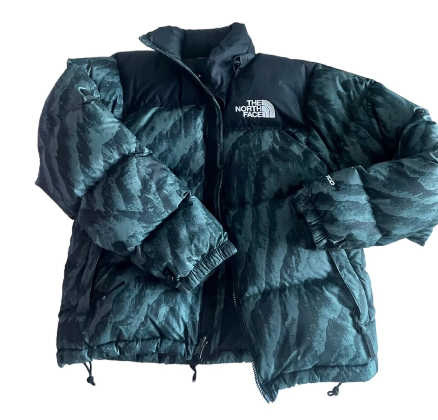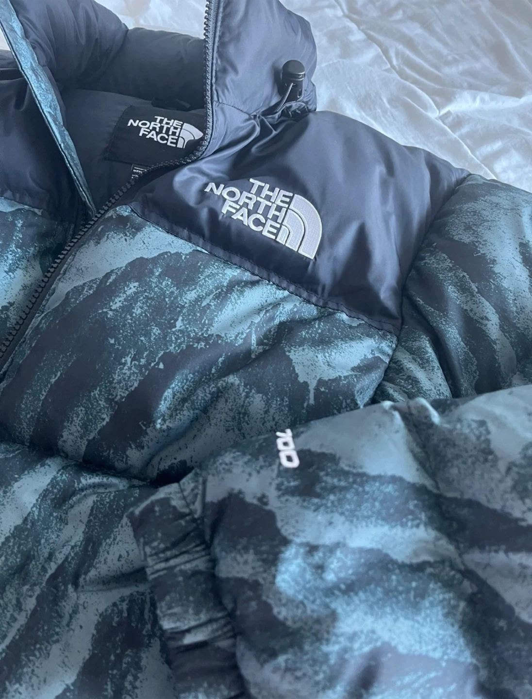 The North Face puffer jacket in green and black. Features a bold pattern and cozy design.