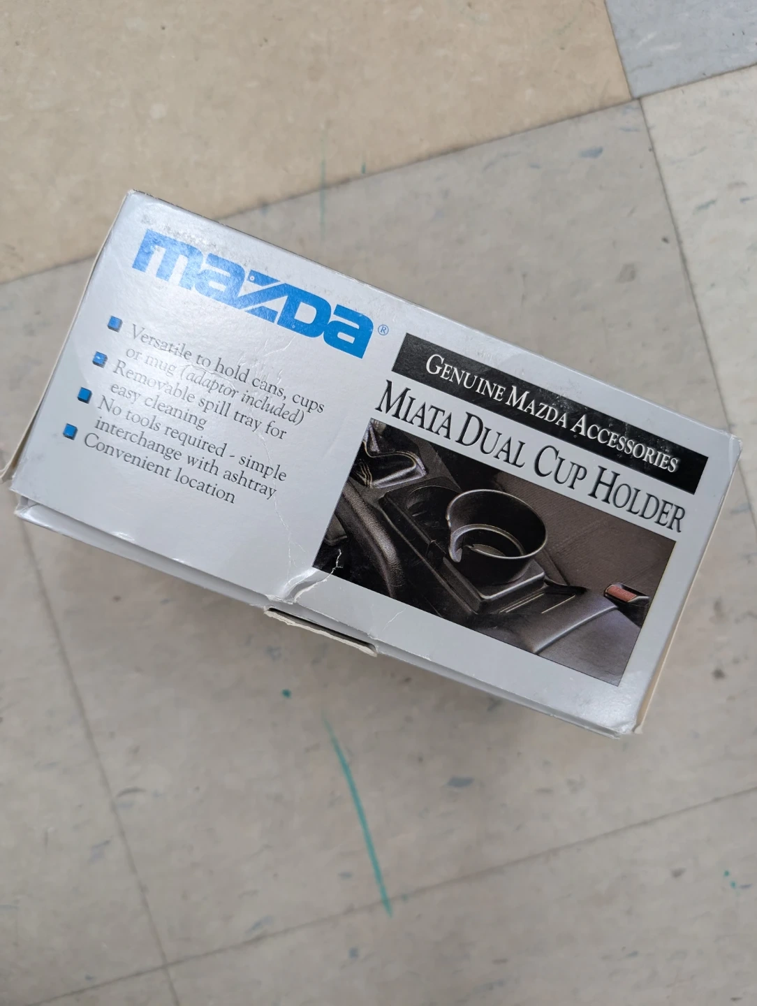 Genuine Mazda accessories dual cup holder for your Miata. It's versatile to hold cans, cups, or mugs with the included adapter. Features a removable spill tray for easy cleaning and simple interchange with the ashtray.
