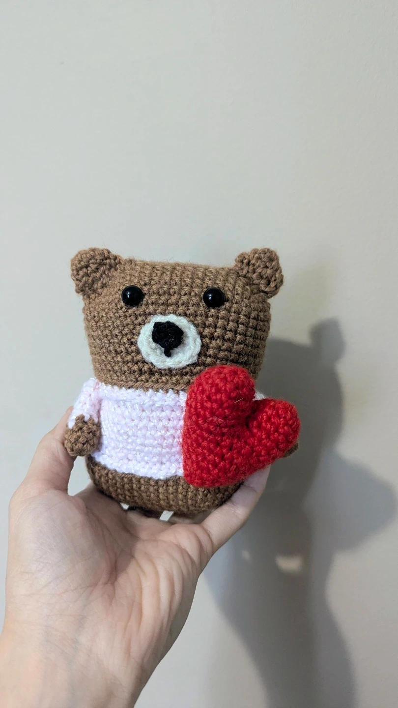 This is a cute, hand-crocheted teddy bear. It's made with brown yarn for the body and a pink sweater. The bear is holding a red heart. It's a lovely decorative item or a small gift! Fit for a last minute Valentine's gift. 6 inches tall