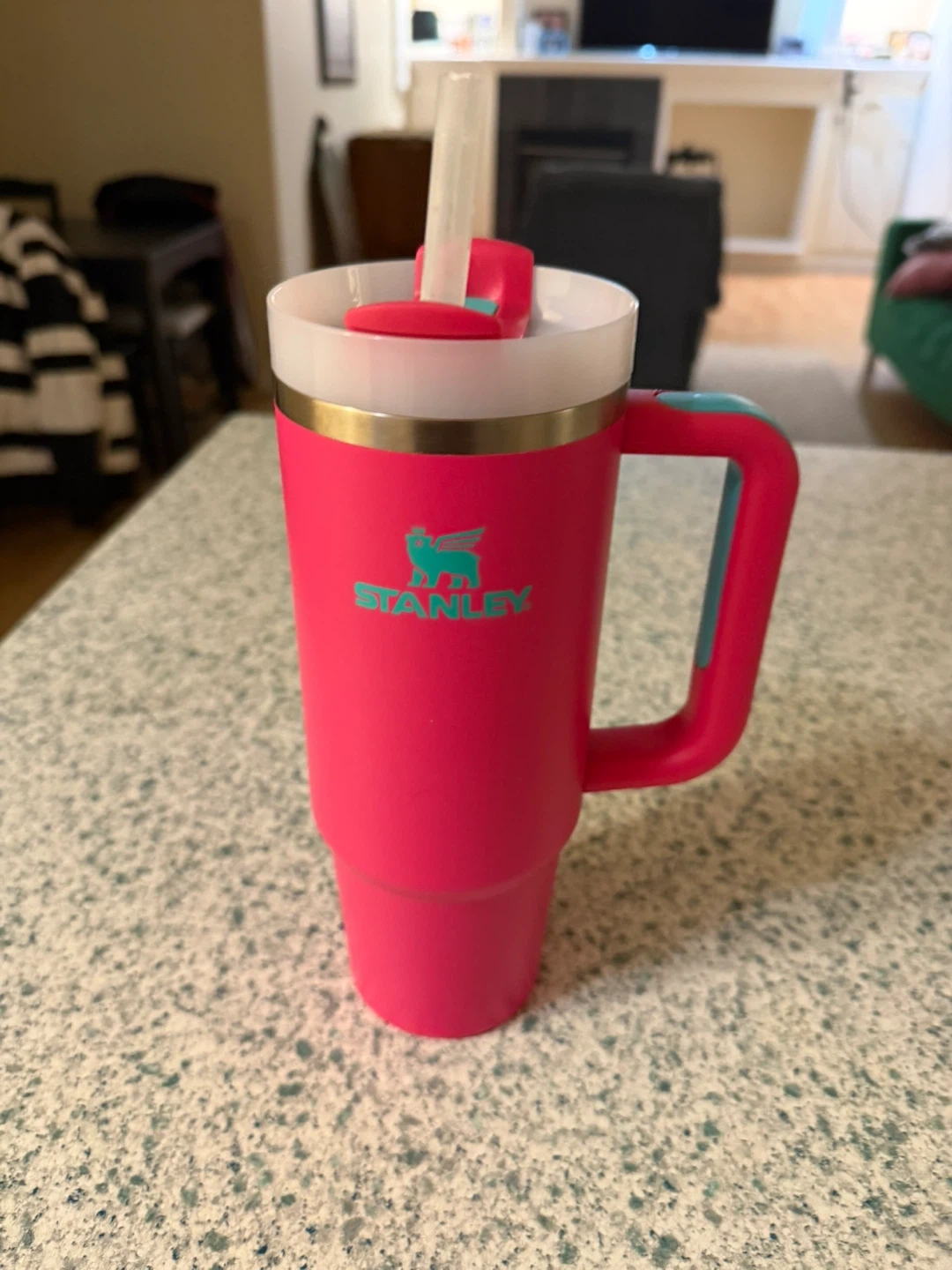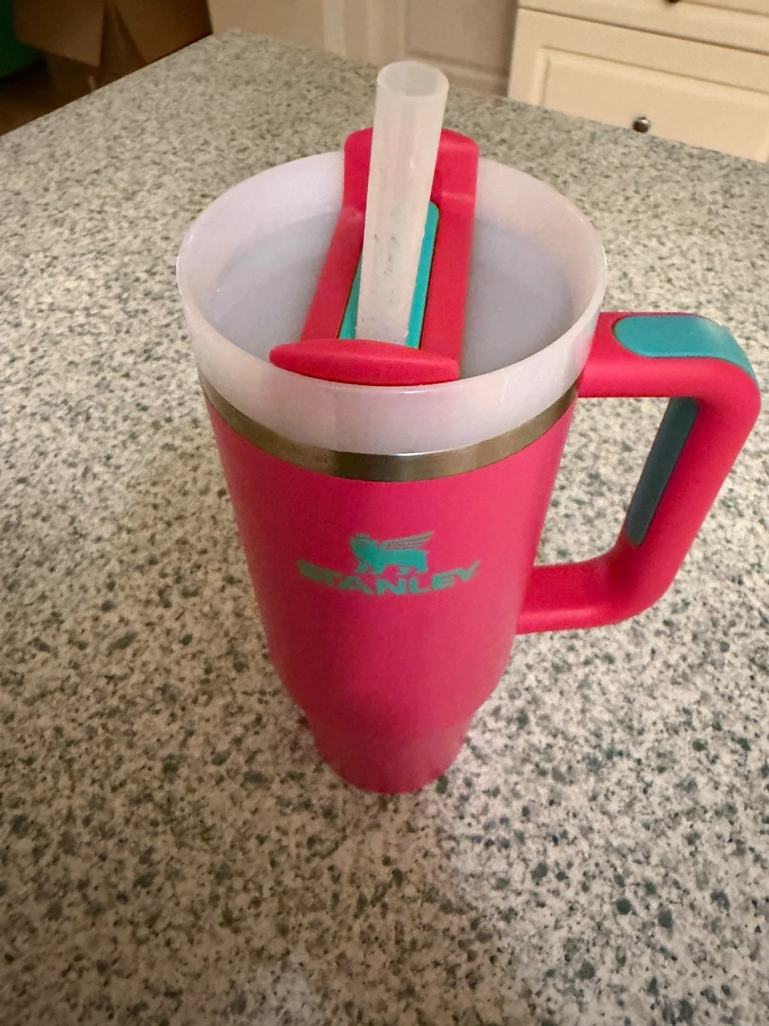 This is a bright pink Stanley tumbler cup with a handle and reusable straw. It's designed to keep your drinks cold for hours! Perfect for staying hydrated on the go.