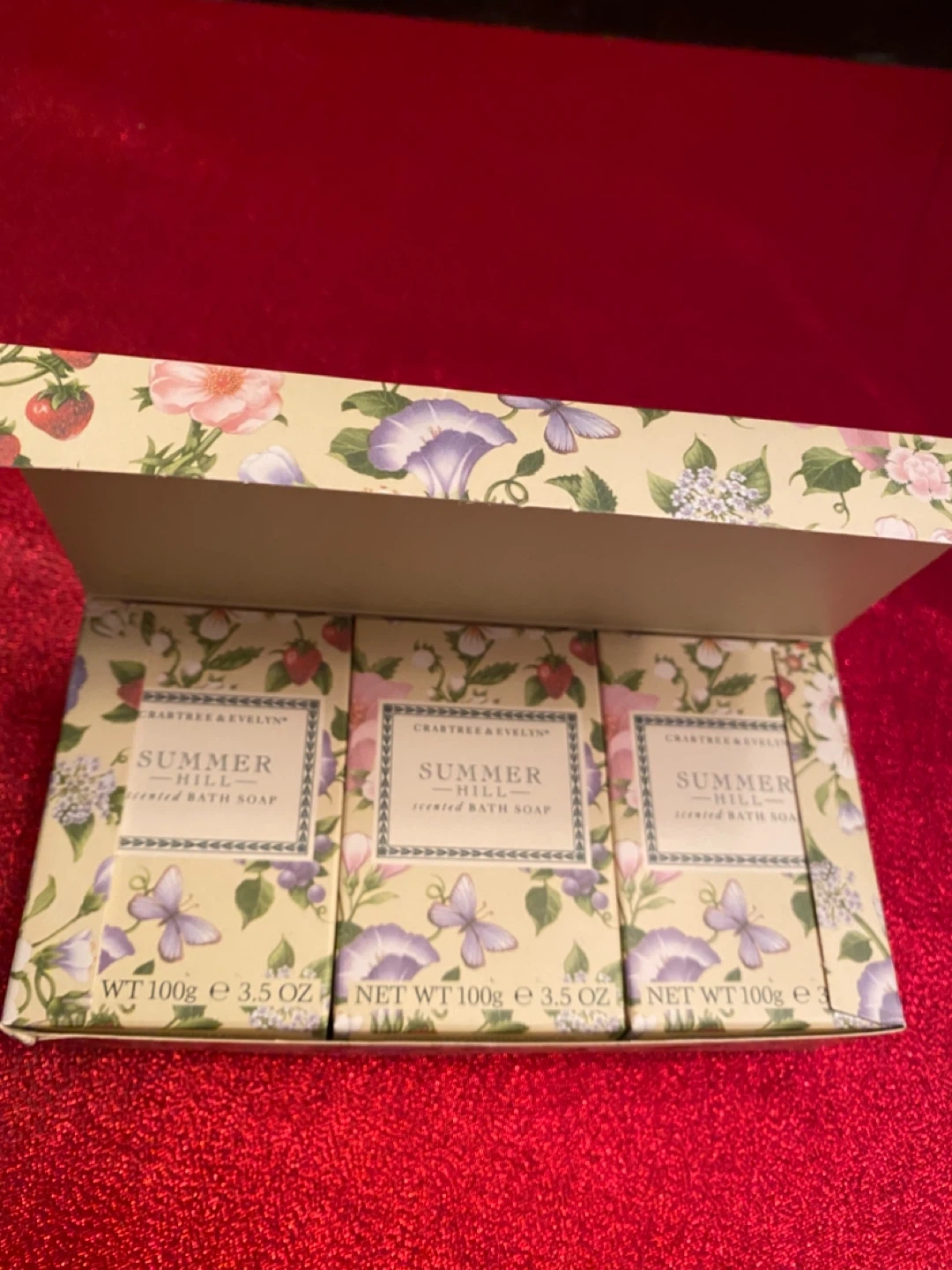 Selling a set of three Crabtree & Evelyn Summer Hill scented bath soaps. Each soap is 100g / 3.5 oz. The soaps come in their original box, making them perfect for gifting or personal use