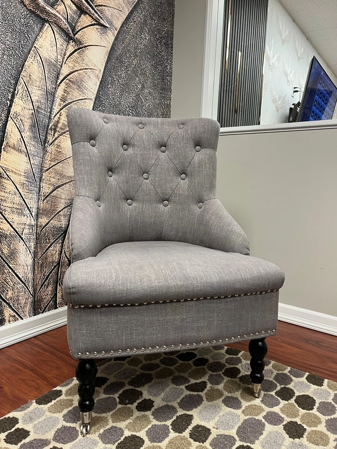 Grey tufted accent armchair with silver nailhead trim. It features black wooden legs with casters. Great for a living room or bedroom!