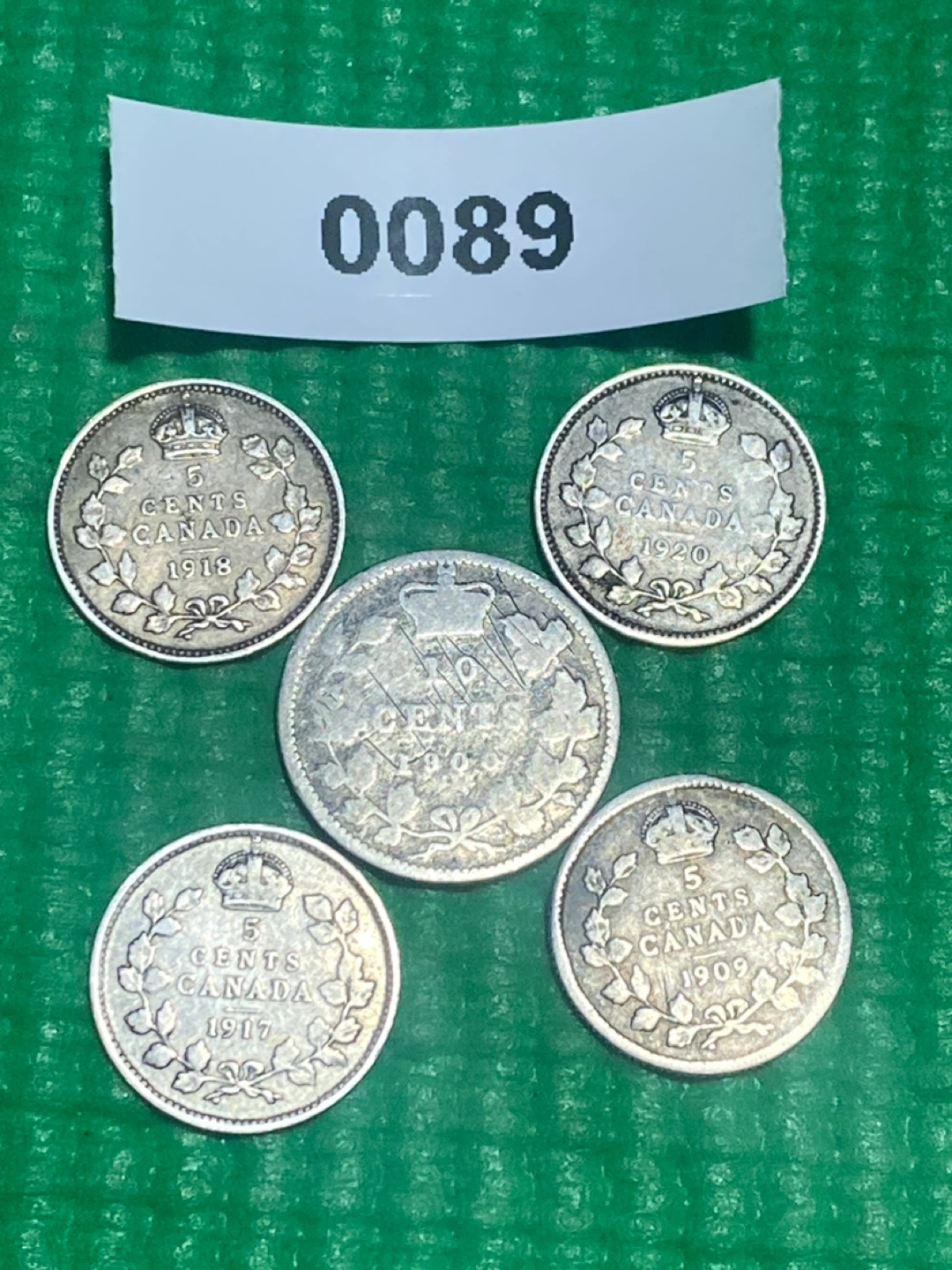 This is a collection of five Canadian 5 cent coins. Dates visible include 1909, 1917, 1918, 1920, and one unreadable coin likely from the early 1900s. These coins are made of silver. They'd be a great addition for any coin collector!