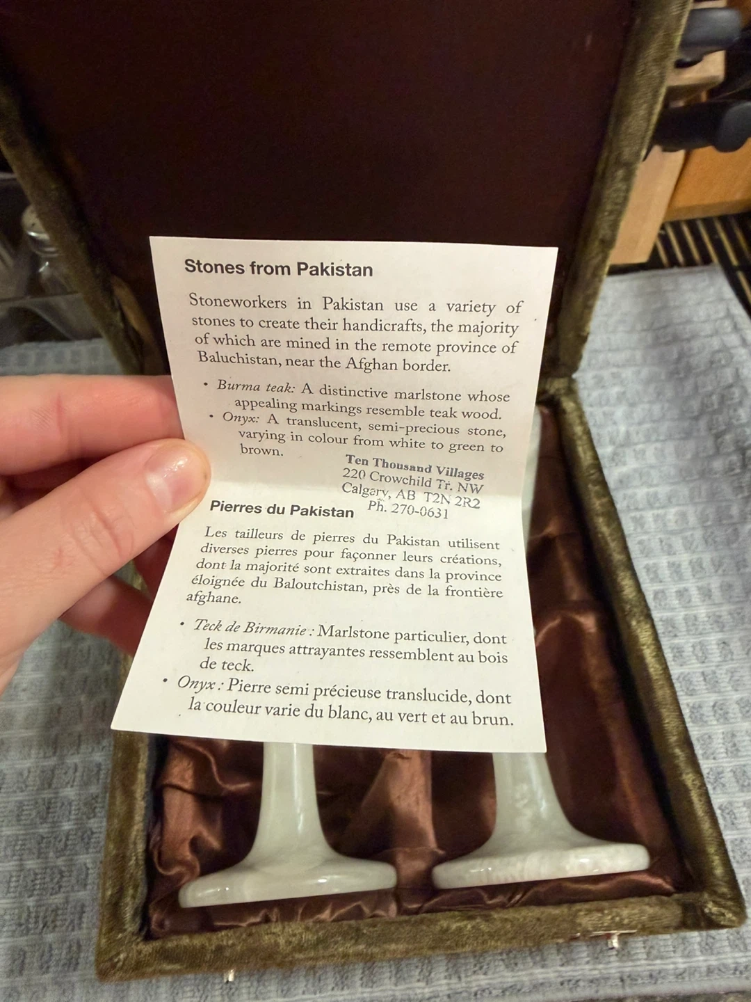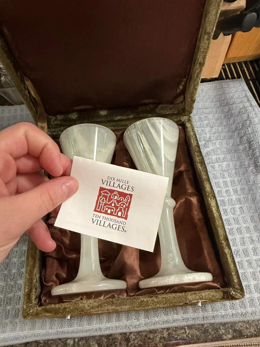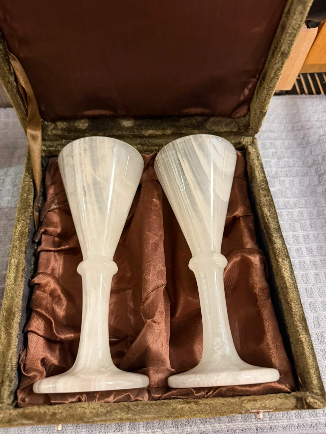Selling a set of two Dix Mille Villages wine glasses made of onyx. They come in a velvet-lined box, perfect for gifting or display. The onyx has a beautiful translucent quality with colours varying from white to green to brown. These handcrafted glasses are from Pakistan.