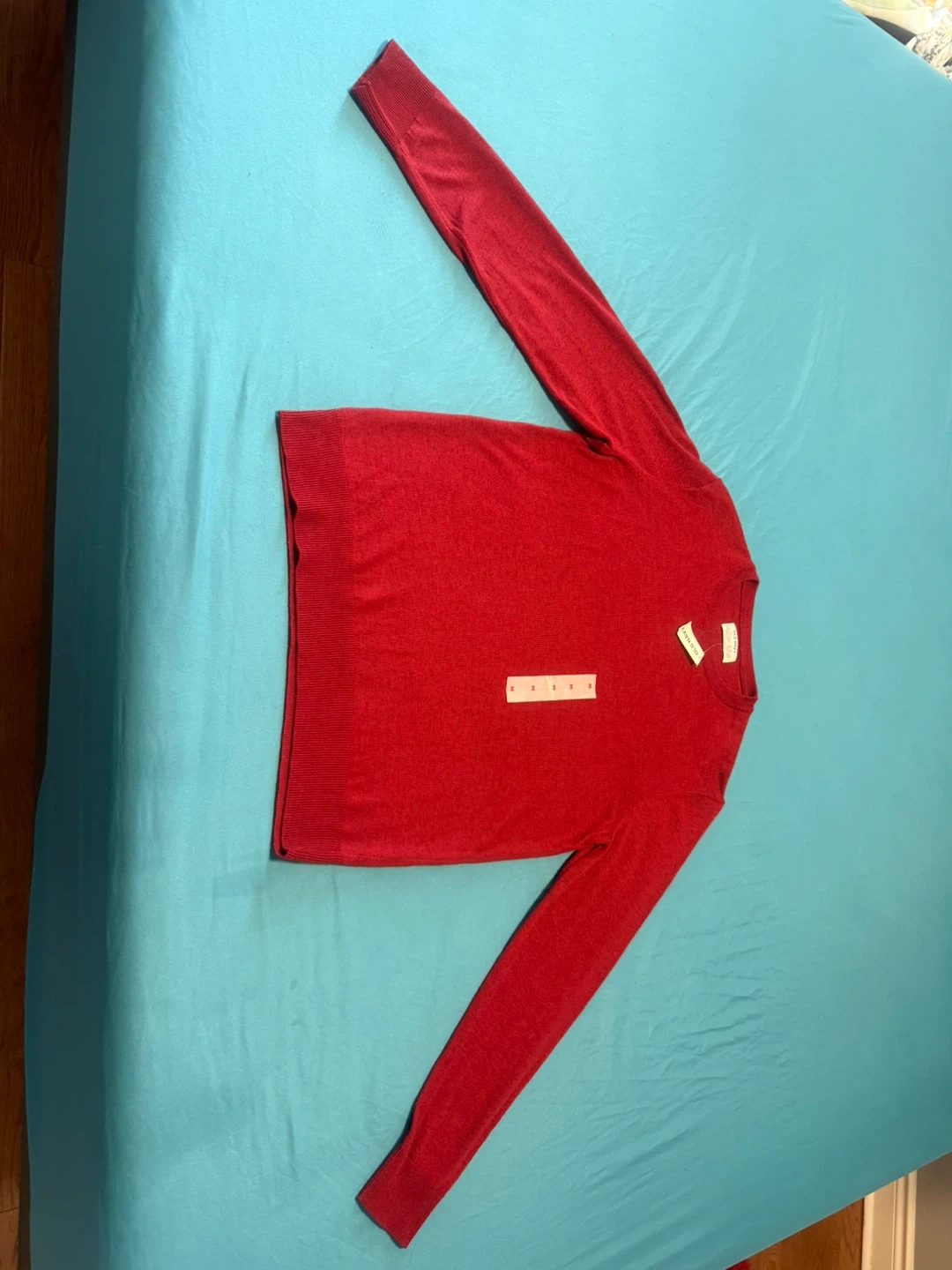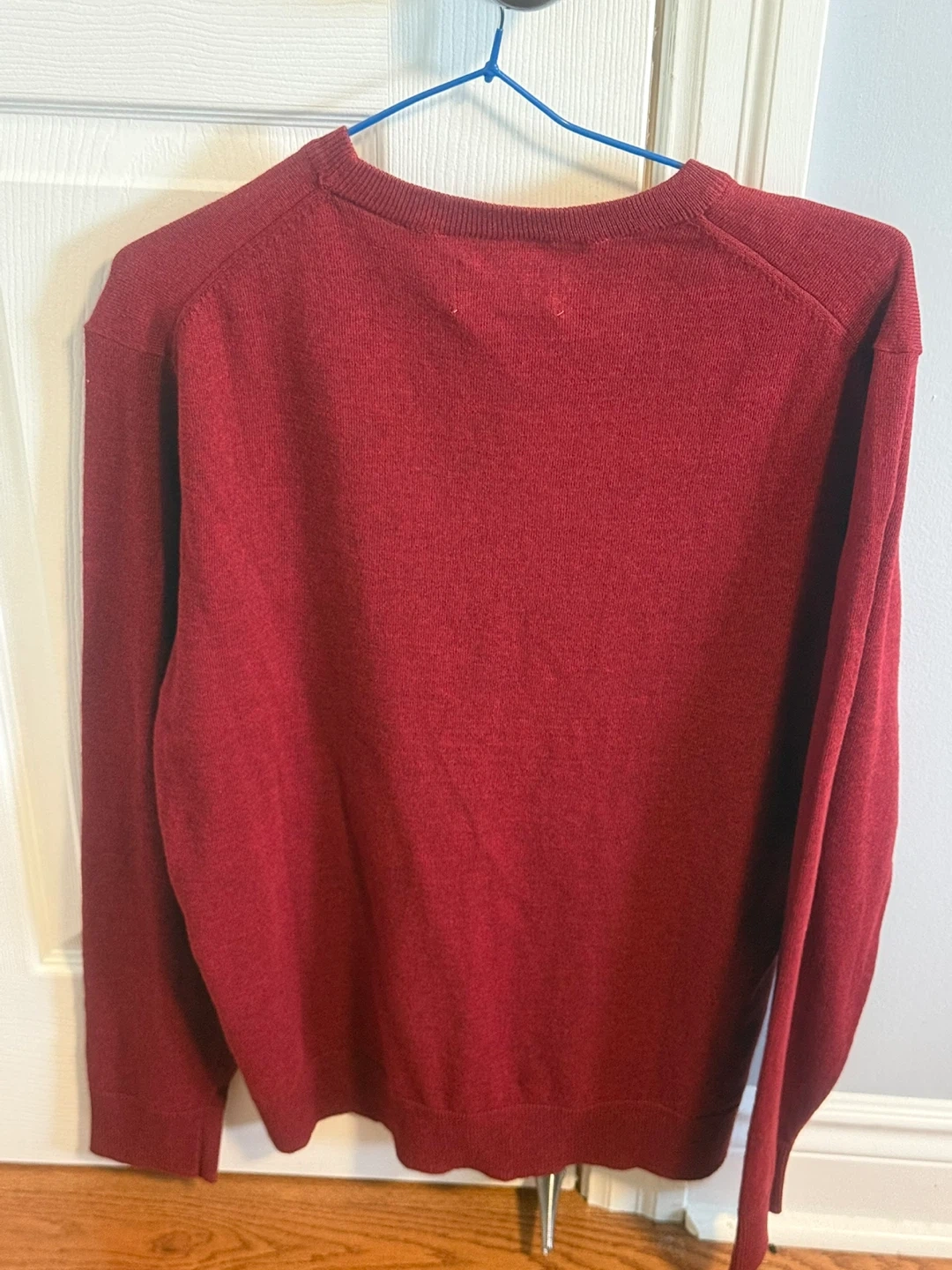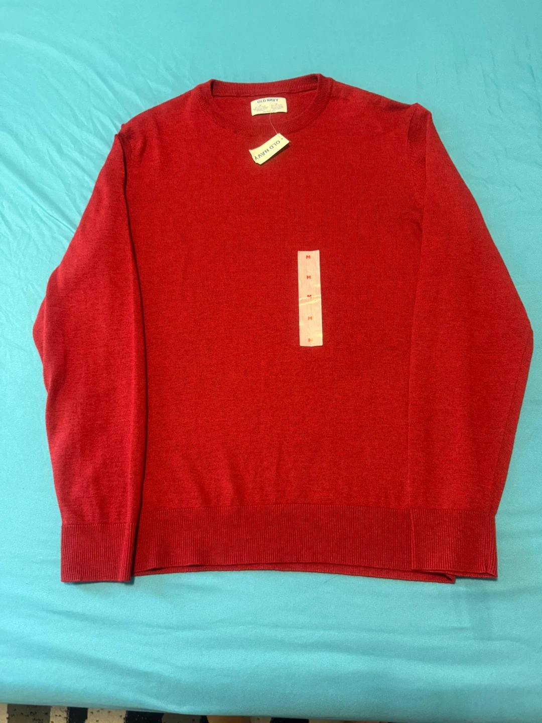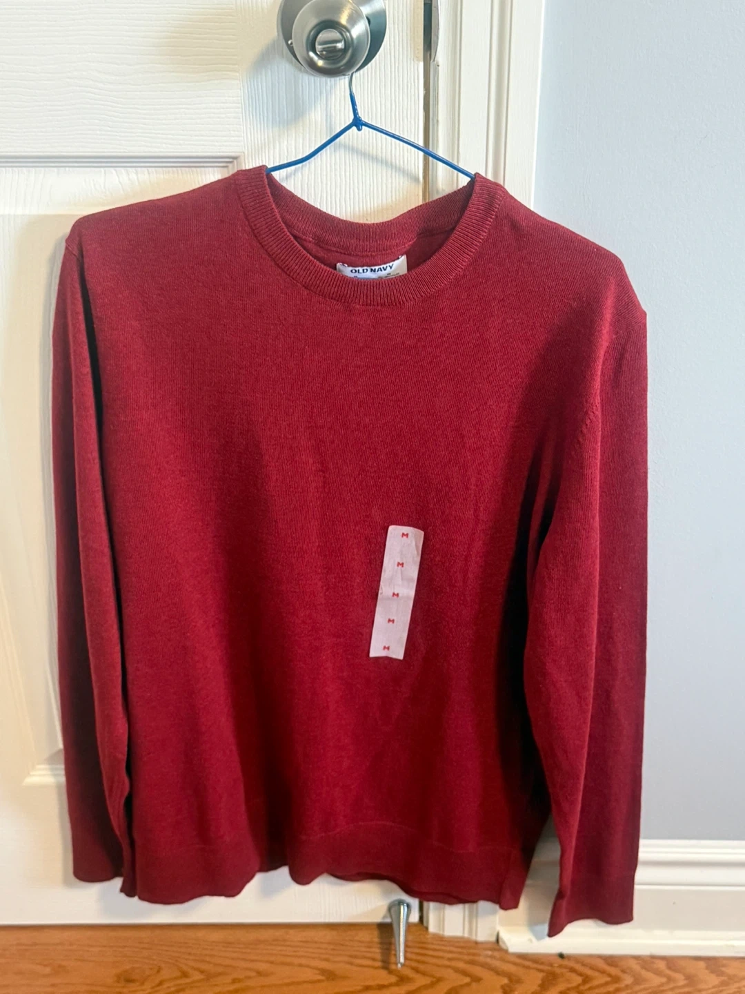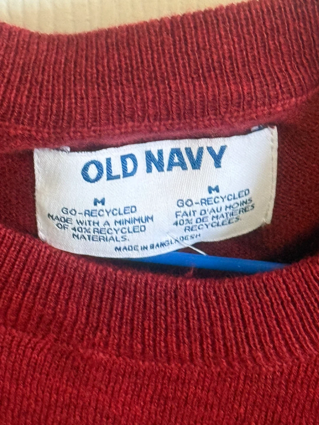 This Old Navy crew neck sweater is made with a minimum of 40% recycled materials. It's size medium and a nice maroon colour. It's great for layering during cooler weather!