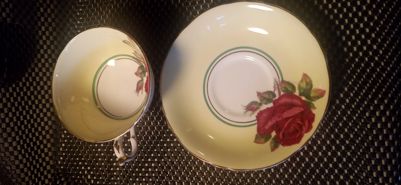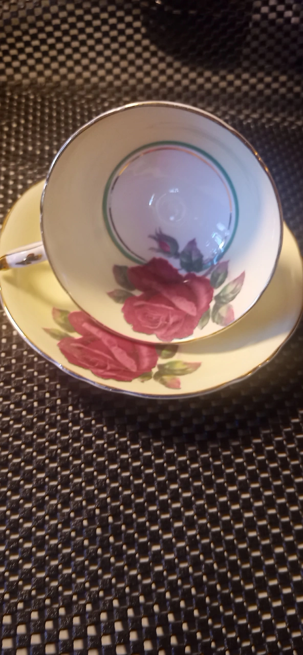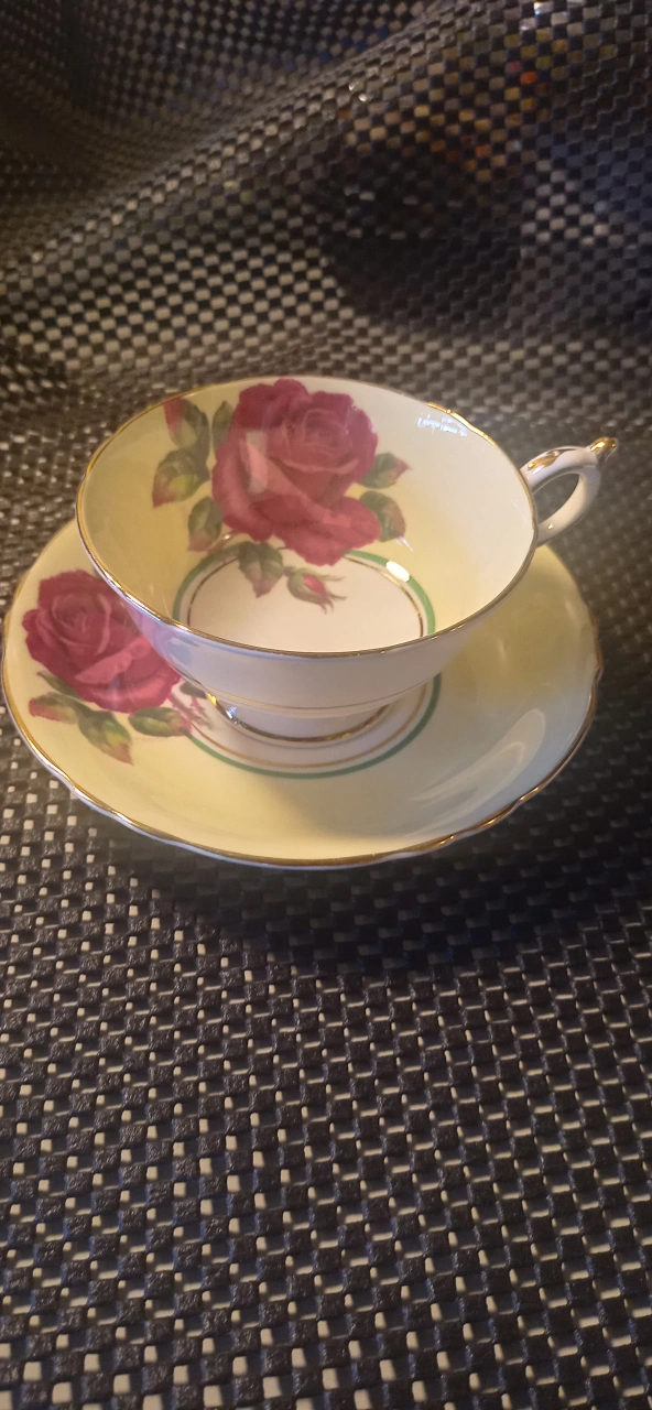 This is a lovely limited Royal Albert tea cup and saucer set. It's a pale yellow with a beautiful red rose design. The set is made of fine bone china. This cups price averages between $450. and $1,200. American. It is mid century and is in perfect condition. I am blowing out my fine tea cups. First to pay gets it! I have others too. Check my list. Great for someone who wants to make a buck or add to their collection. thanks Jim . please compare online. eBay and Etsy,etc and see what a great deal this is!!! Reasonable offers accepted...