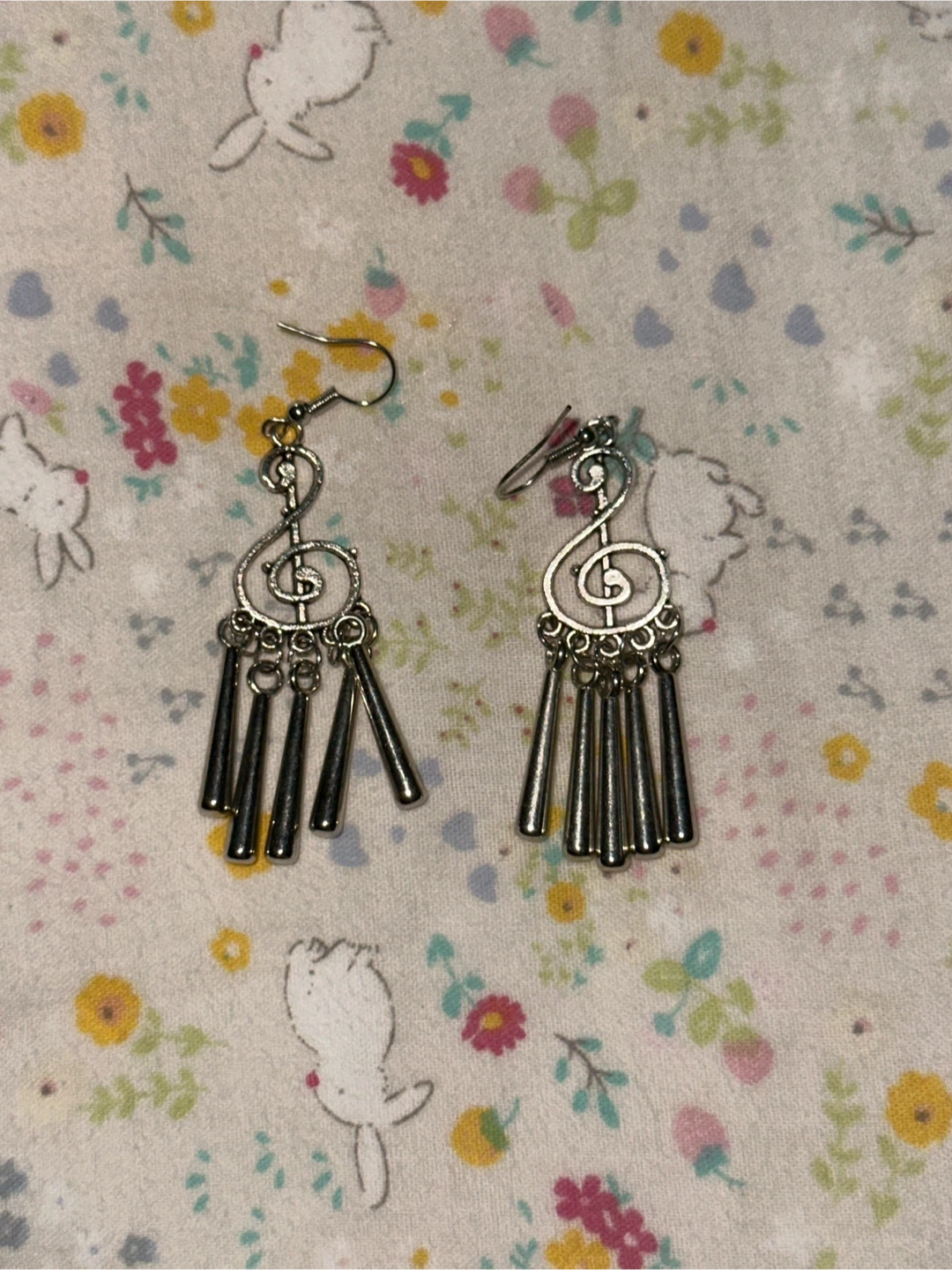 Cute silver tone earrings featuring a G clef design with dangling chandelier-style charms. These are a fun accessory for music lovers! Metal material.