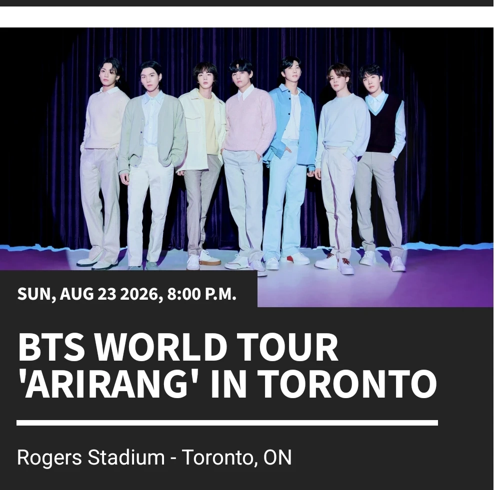 This is a ticket for the BTS World Tour 'Arirang' concert in Toronto. It's scheduled for Sunday, August 23, 2026, at 8:00 PM. The venue is Rogers Stadium.
