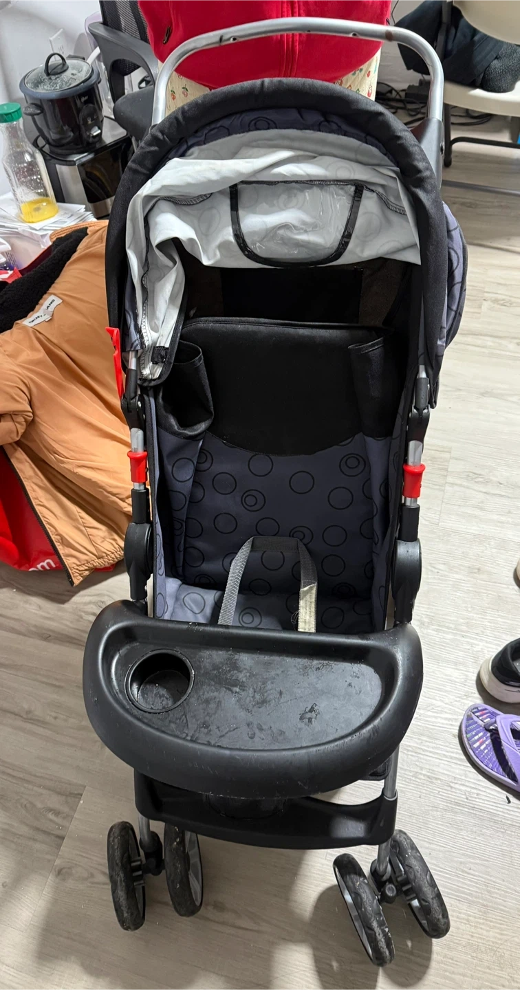 Selling a used baby stroller in black and gray. It has a tray for snacks and drinks, and a comfortable seat for your little one. Perfect for walks in the park or trips to the store!