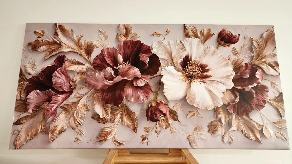 large floral canvas, burgundy wall art, textured flower artwork, luxury home decor, oversized canvas print, living room wall art, bedroom decor, modern floral painting, 3D floral canvas, elegant wall decor, high-quality canvas print, neutral home decor, statement wall art
