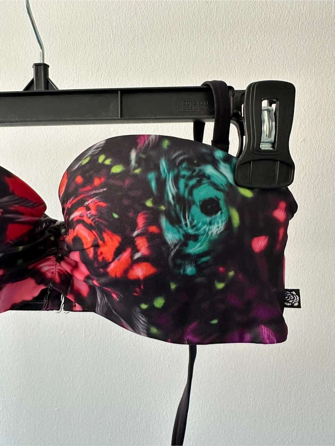 This strapless swim bra features a bold, colourful floral print on a black background. It has a front clasp closure and adjustable ties for a secure fit. The material is a polyester blend. Underbust measures 24 inches.
