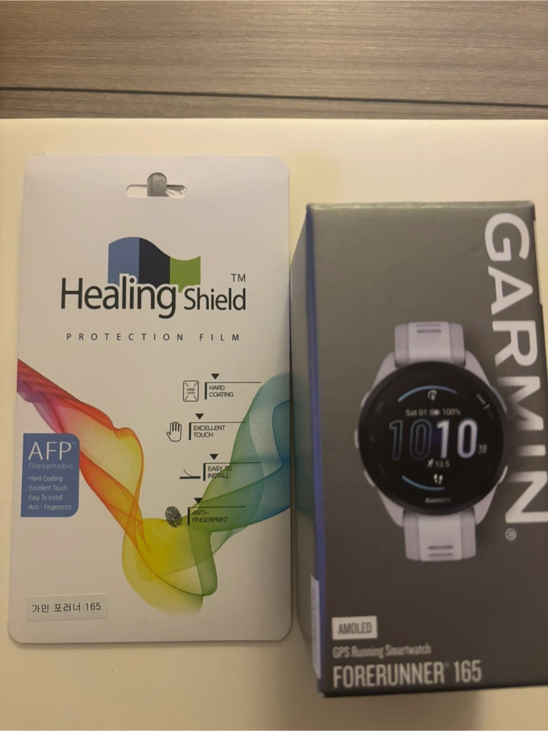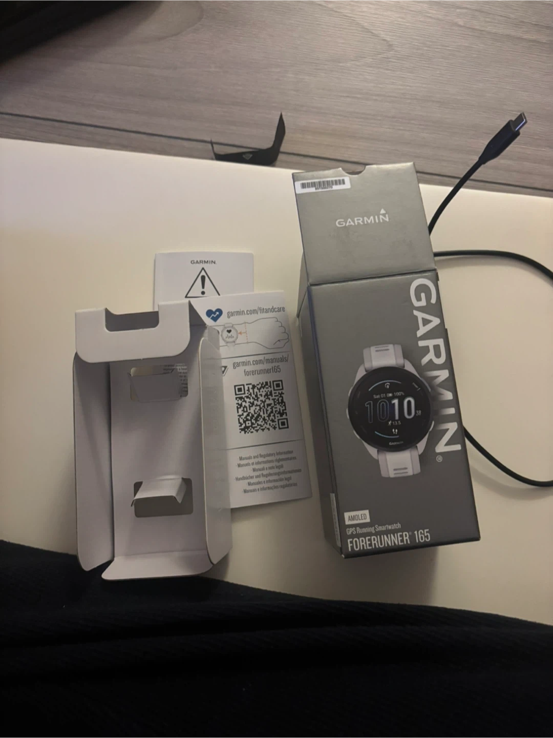Garmin Forerunner 165 GPS running smartwatch. Barely used. Good condition. No scratch. AMOLED display. Includes charging cable. Also comes with a Healing Shield screen protector.