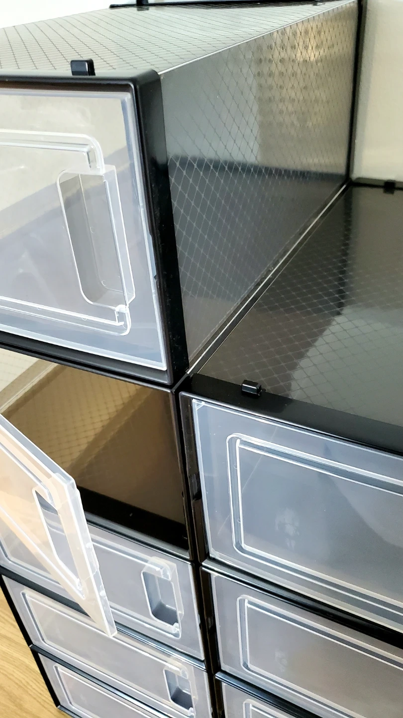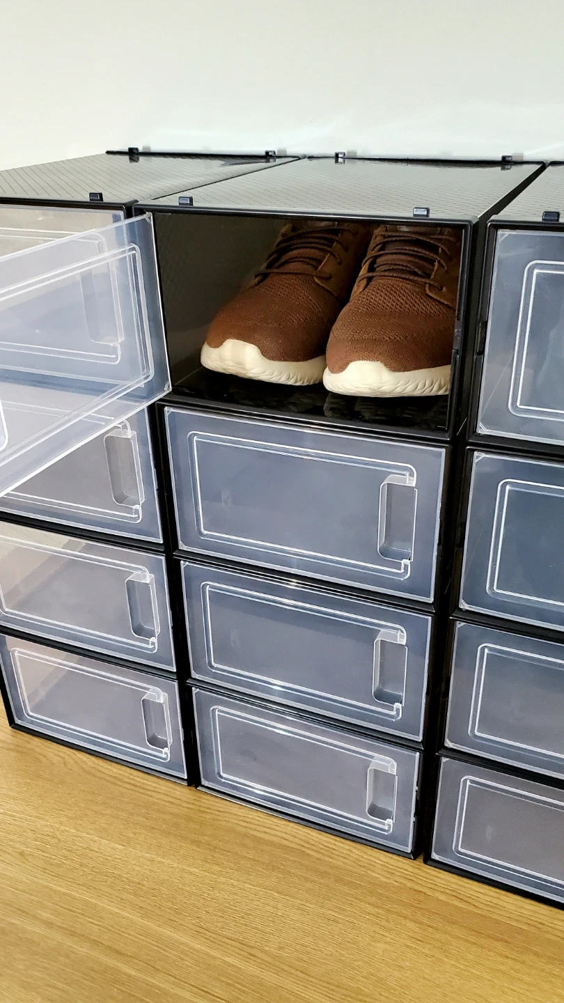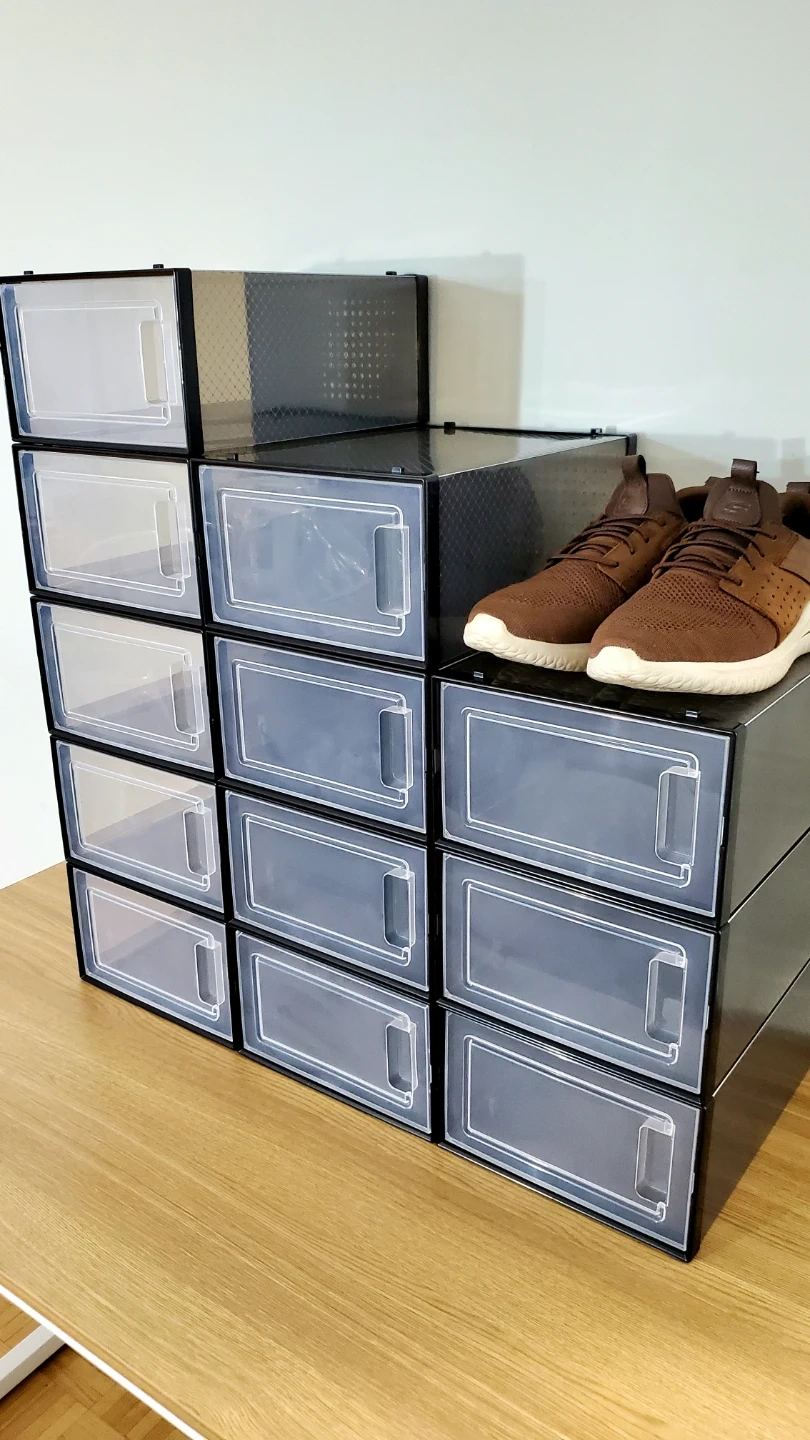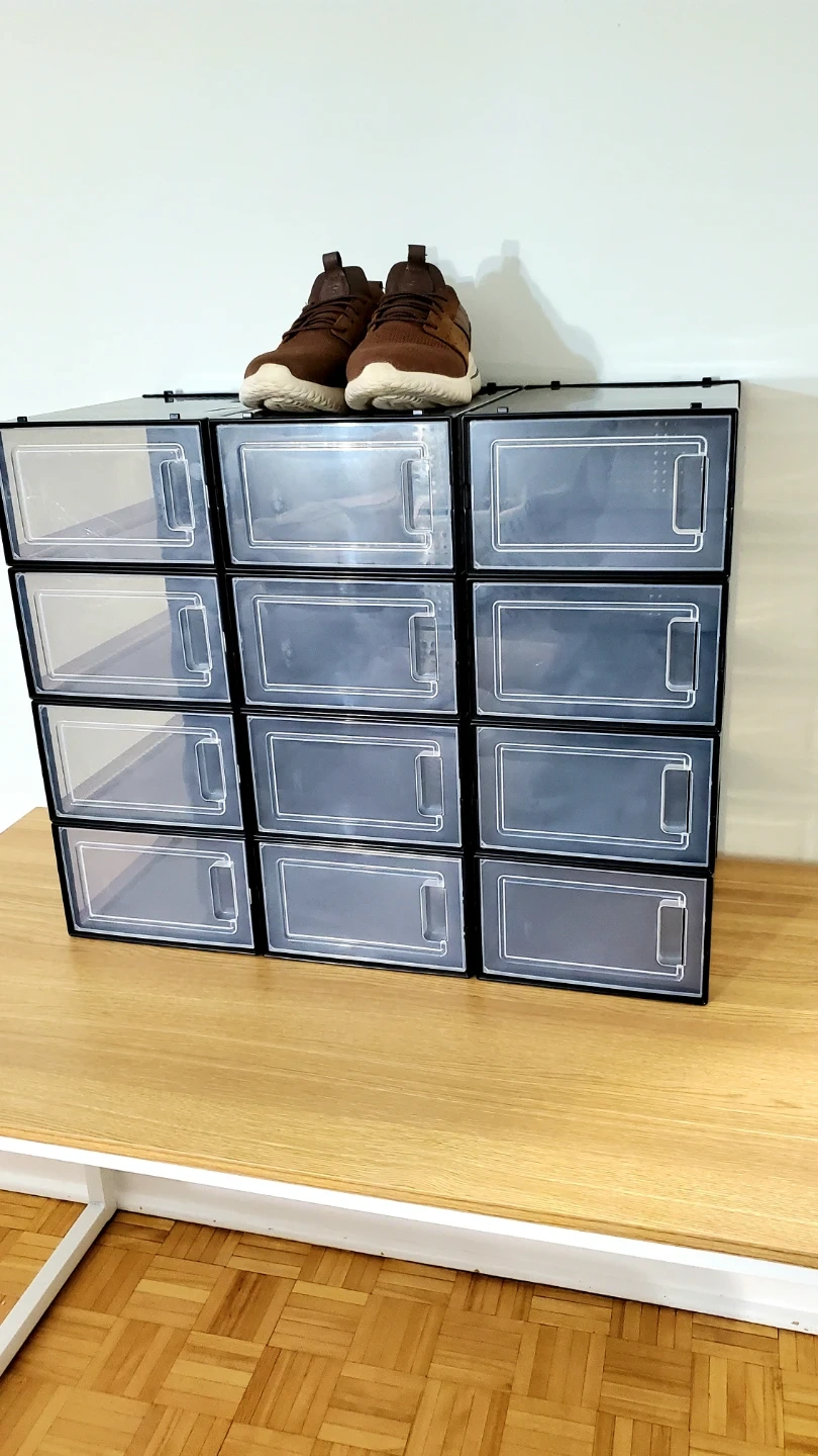 This 12-pack of shoe storage boxes are brand new and can be used to organize shoes, clothes, cosmetics, etc. They're still in a box but should be easy to assemble. The black translucent design allows you to see what's inside. The boxes can hold weight, and they are stackable to each other. Each one has a medium size (my sample shoe is 9.5 mens, but women's shoes will even fit more), and you can see dimensions in one of my photos. Max is size approximately 12. Please don't ask for a lower price (see orig price $140 ) so save $$.