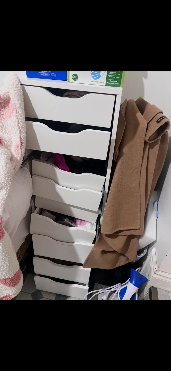 Selling this IKEA drawer unit (white), less than 1 year old. Still usable and sturdy, but the drawers are not aligning properly (as seen in photos). Not sure how to fix it, maybe needs adjustment or re-installation.