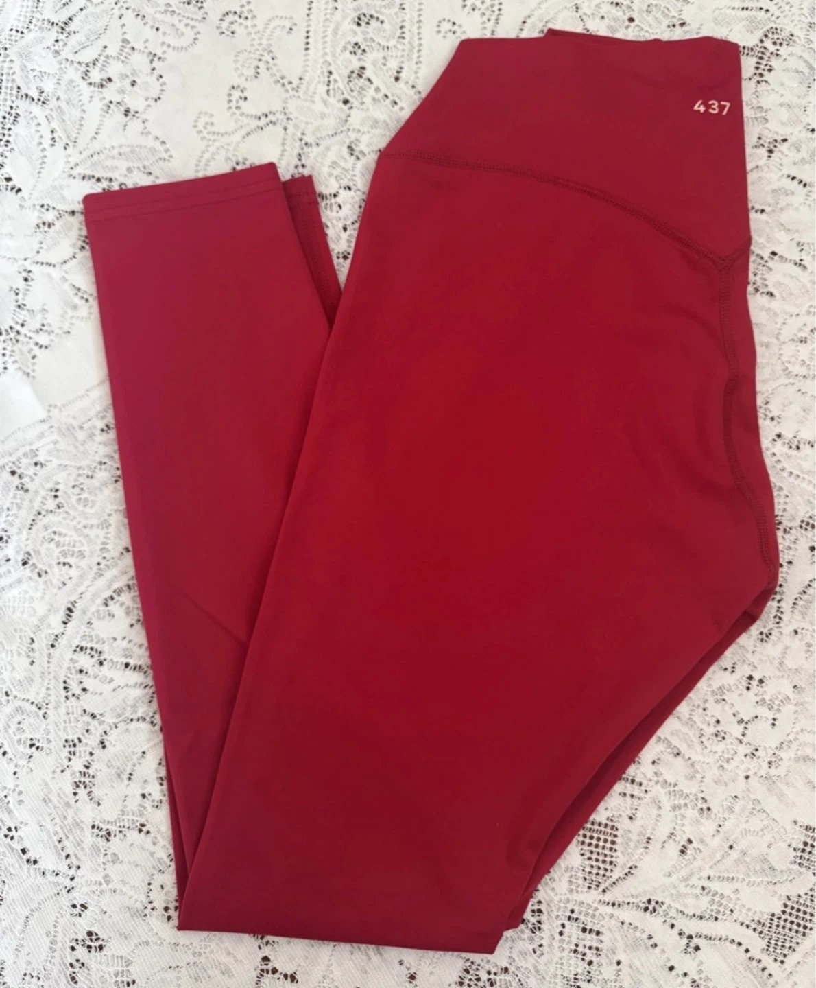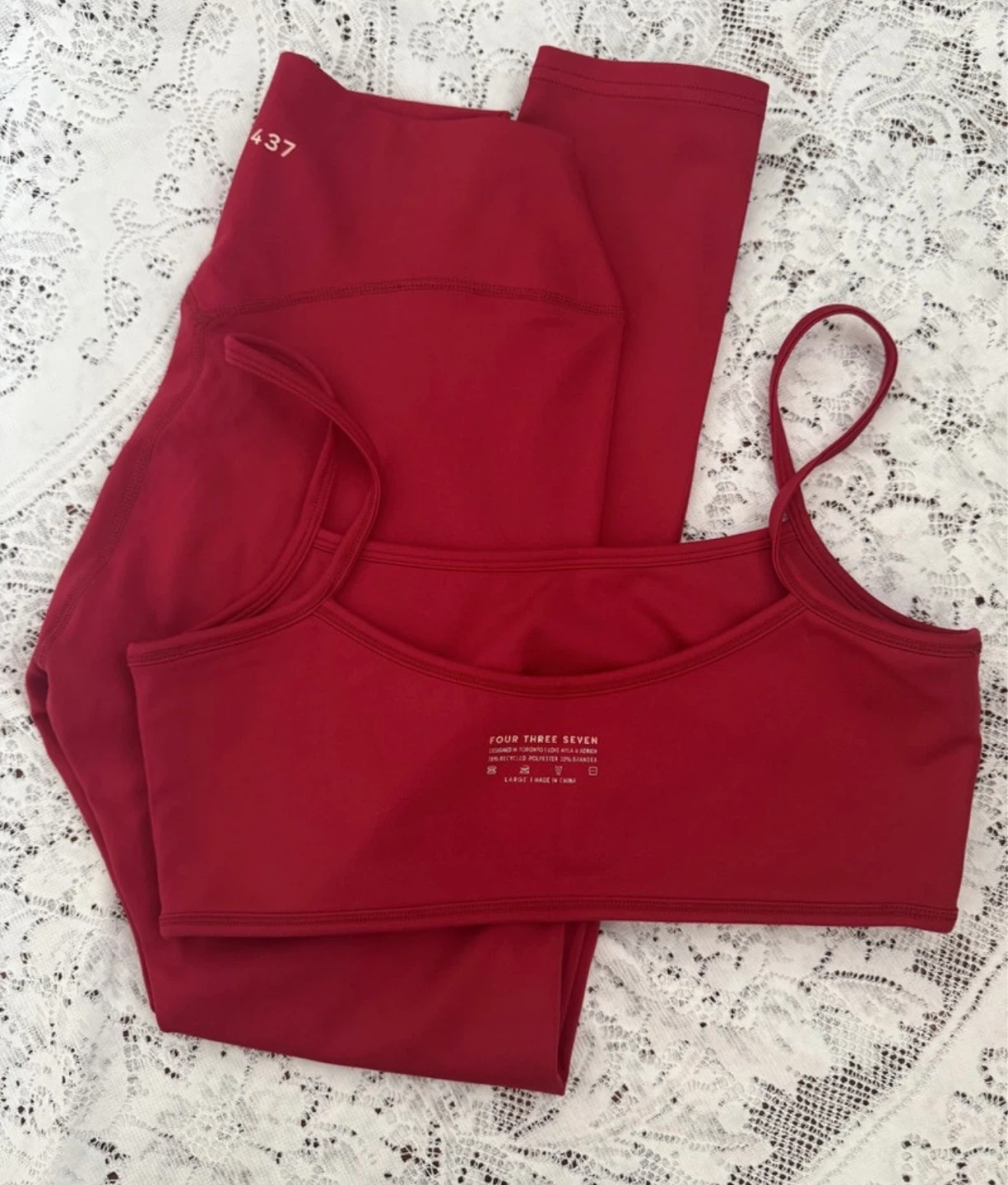 Selling a vibrant red activewear set that includes a supportive sports bra top and matching leggings!