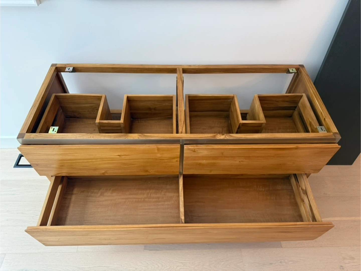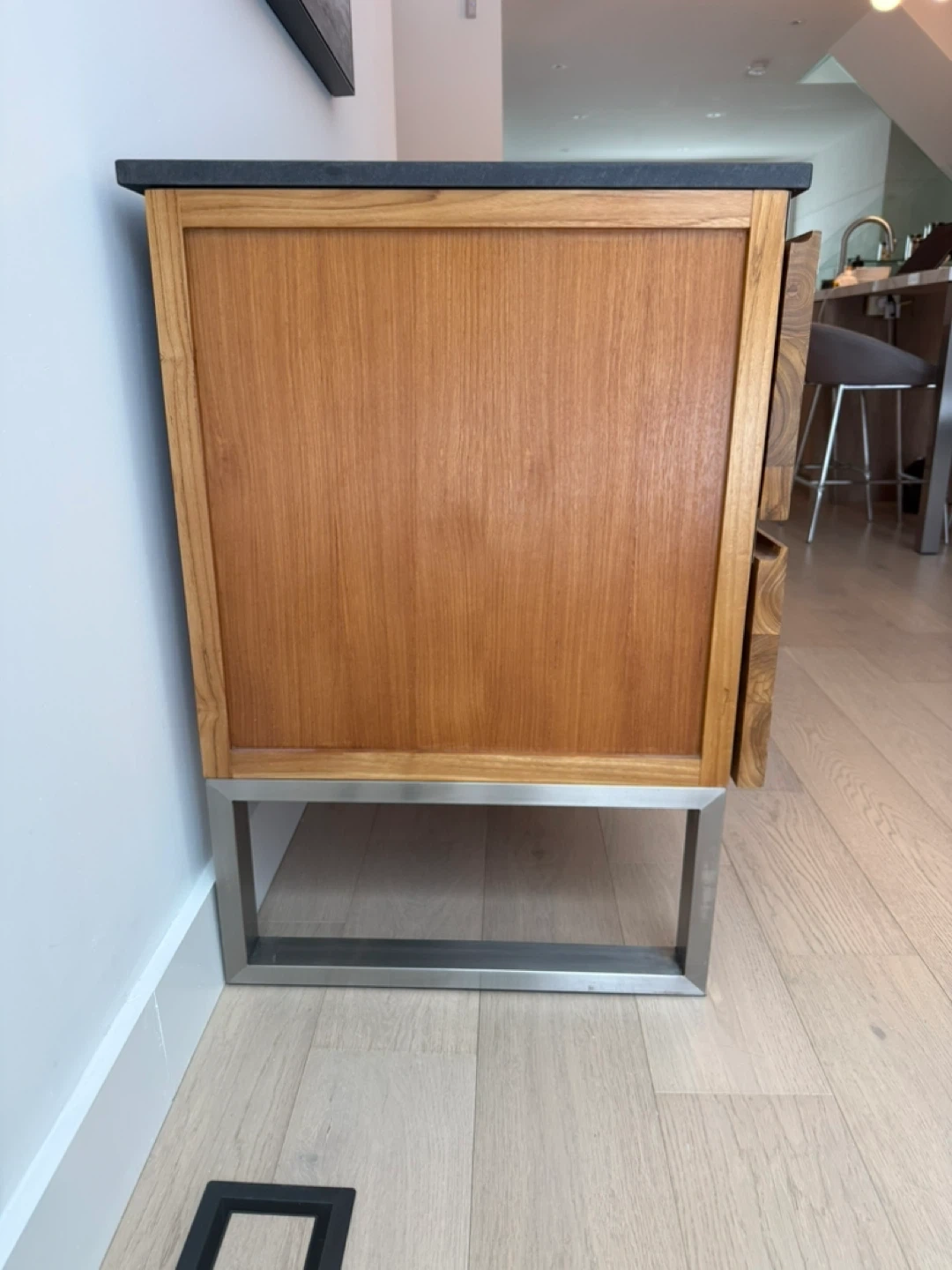 Solid wood vanity/ storage cabinet with a modern dark grey countertop and a brushed stainless steel frame. It features three sets of drawers for ample storage. This piece would be great for a bathroom renovation. Originally purchased from Montreal and shipped to Toronto.