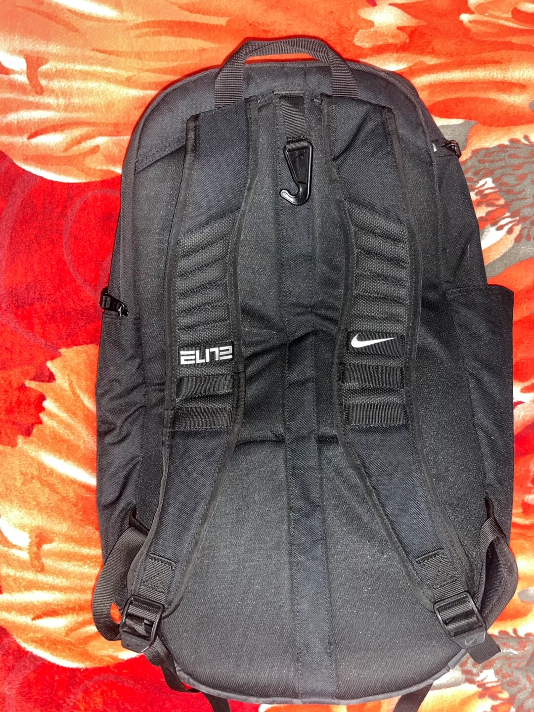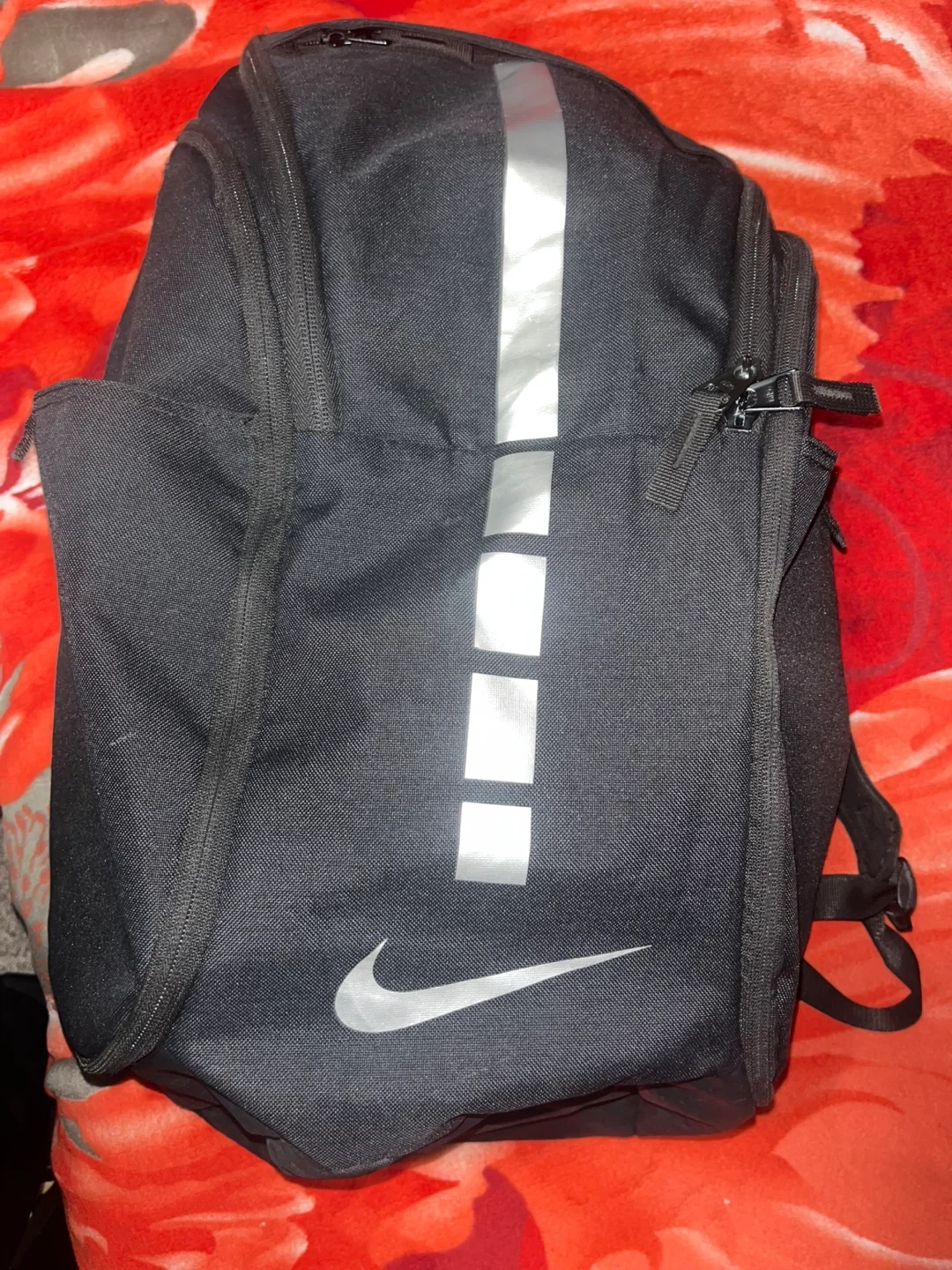 Black Nike Elite backpack with silver stripe detail. Multiple compartments for storage. Durable material, perfect for everyday use or sports gear.