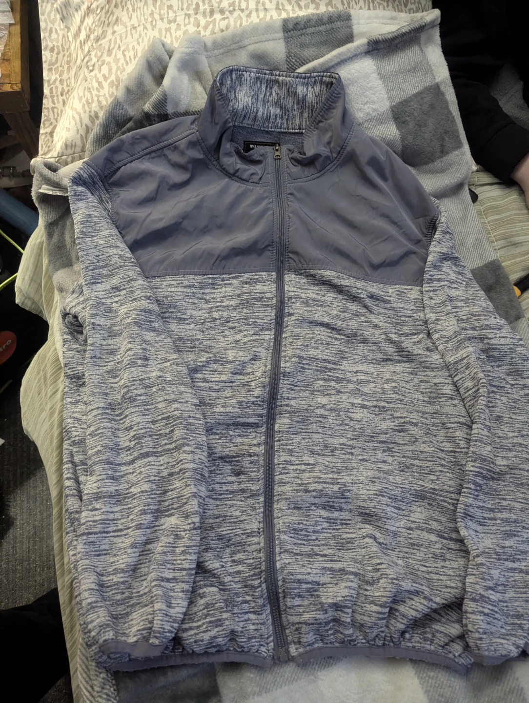 Grey Walnut Creek track jacket with a full zip closure. Features a soft heathered knit body and smooth nylon upper panel. It's perfect for casual wear or light activity!