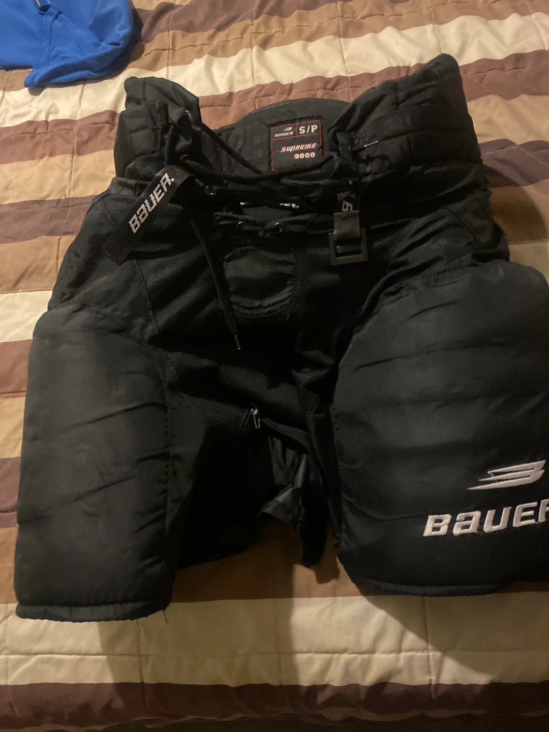 Selling a pair of Bauer Supreme 3000 hockey pants in size adult S/P. They're black and in great condition for hitting the ice! Excellent protection and light weight. Price is firm