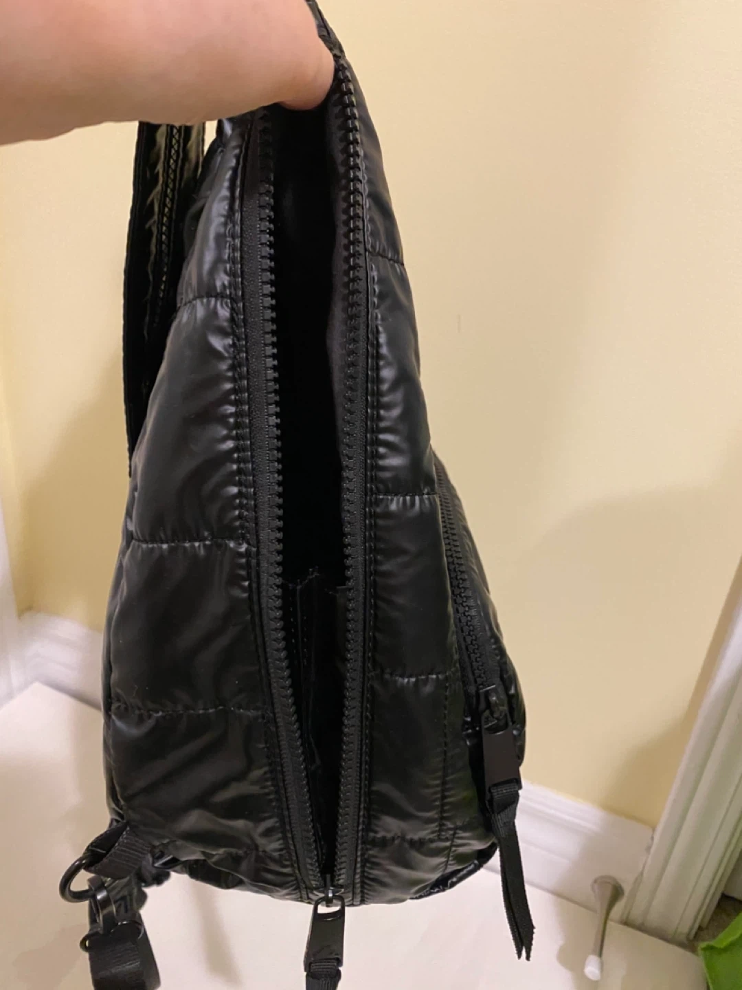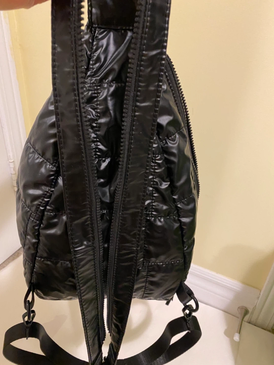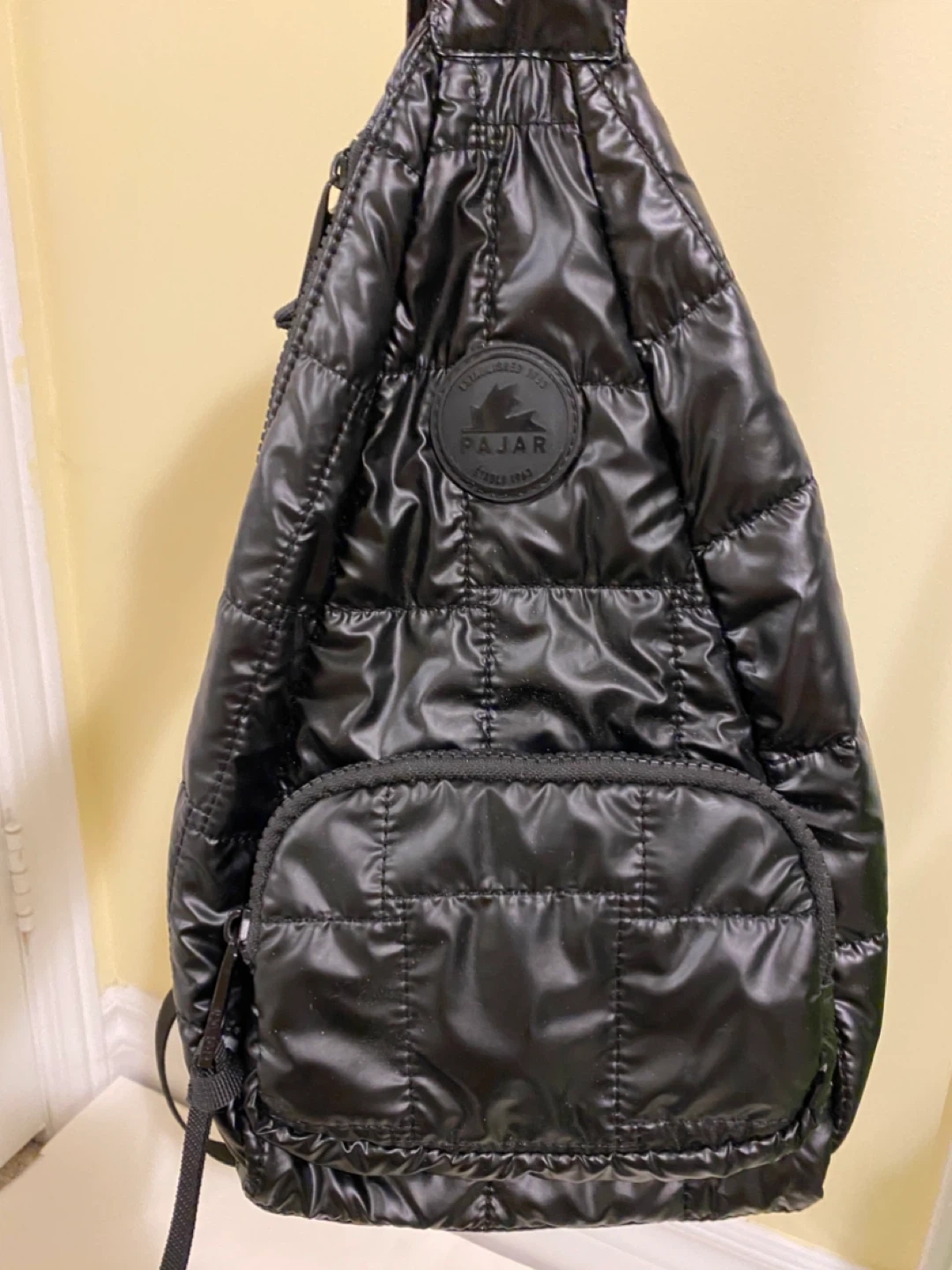 Pajar quilted black sling bag. Shiny nylon material with a front zippered pocket. It has adjustable straps for comfort.
