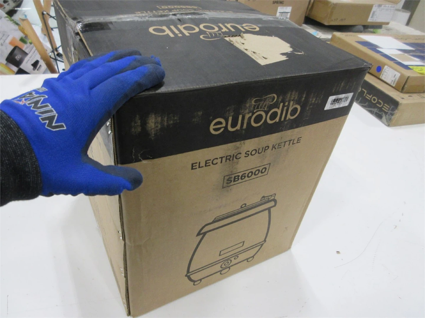 This is a brand new Eurodib electric soup kettle, model SB6000. It's black and comes with a stainless steel lid. This kettle is perfect for keeping soups and other liquids warm.