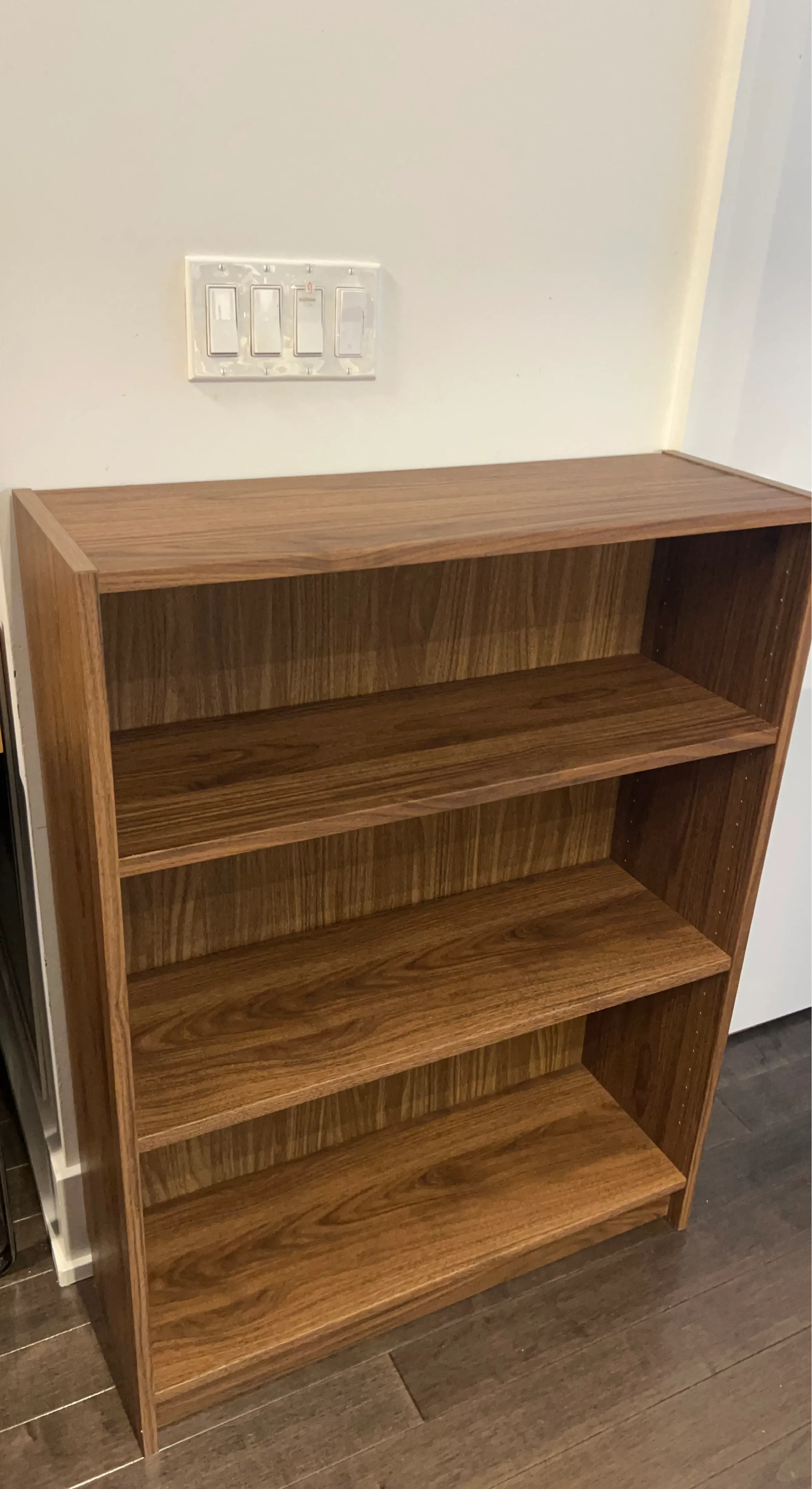 This is the BILLY bookcase from IKEA. It has a brown walnut effect finish. The dimensions are 80x28x106 cm.