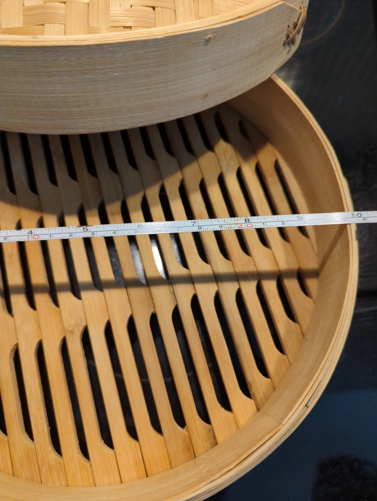 Selling a bamboo steamer basket with a lid. It looks to be around 10 inches in diameter! Perfect for steaming veggies, dumplings, or anything else you fancy