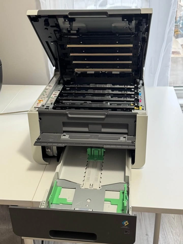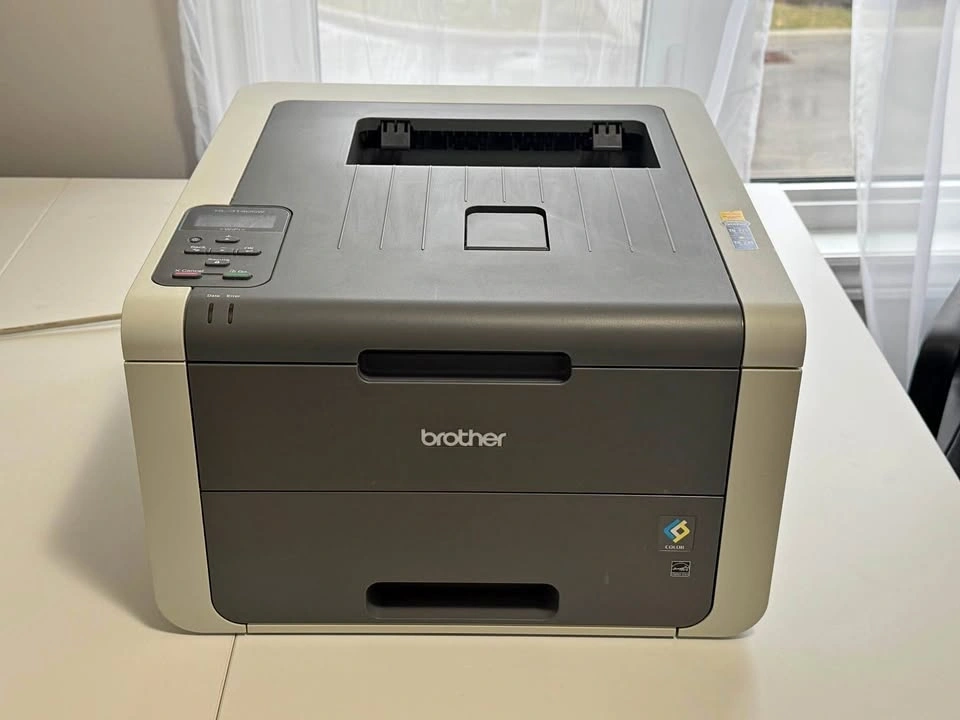 Brother HL-3140CW color laser printer with built-in Wi-Fi. Prints color and black and white from the paper tray or manual feed. Comes with used toner cartridges plus an extra set of brand new cartridges (cyan, magenta, yellow, and black).