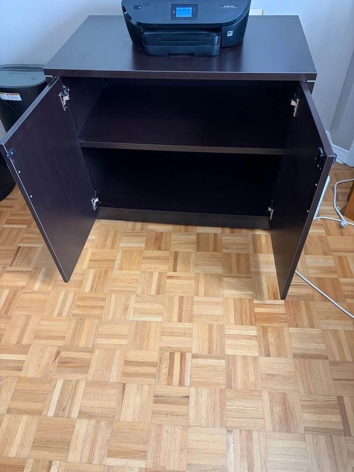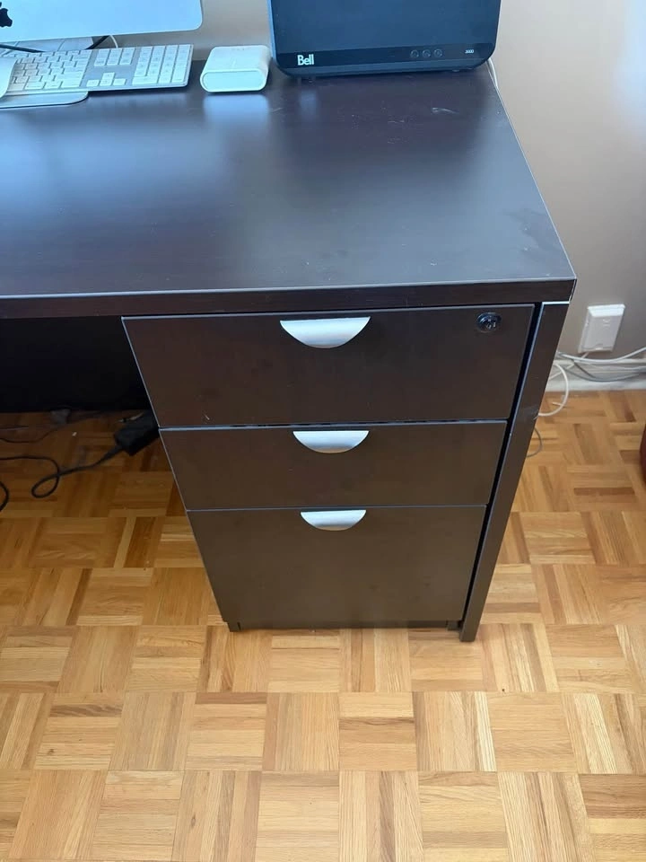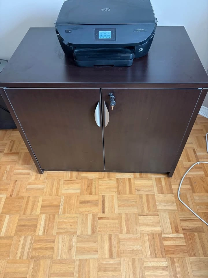 L-shaped office desk with two sides, each approximately 67" long. One side has two drawers and a file hanging space. The other side also has two drawers for hanging files. The cabinet is approximately 36" wide, 22" deep, and 30" high with a single shelf inside. Both desk drawers and the cabinet are lockable. The desk has been partially disassembled for easier moving, and all original hardware and assembly instructions are included. You will need a truck or van to transport this. I'm happy to help you load it up.