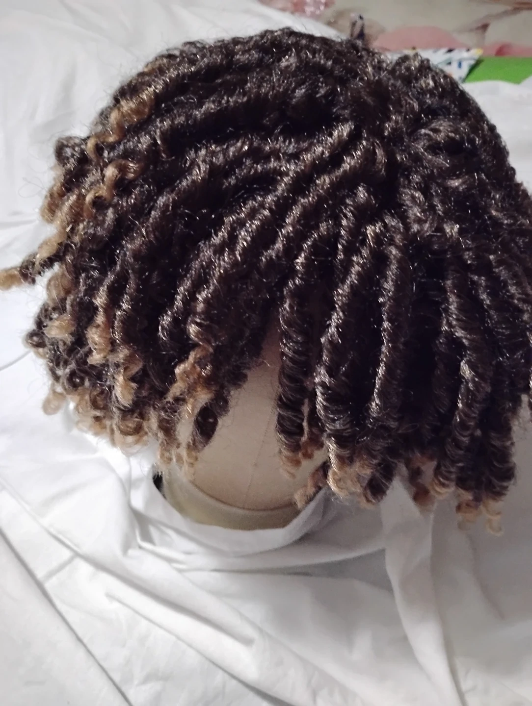 This wig features a twist-out style with beautiful brown and blonde highlights. The texture is designed to mimic natural curls. It's suitable for a quick style change or everyday wear.
