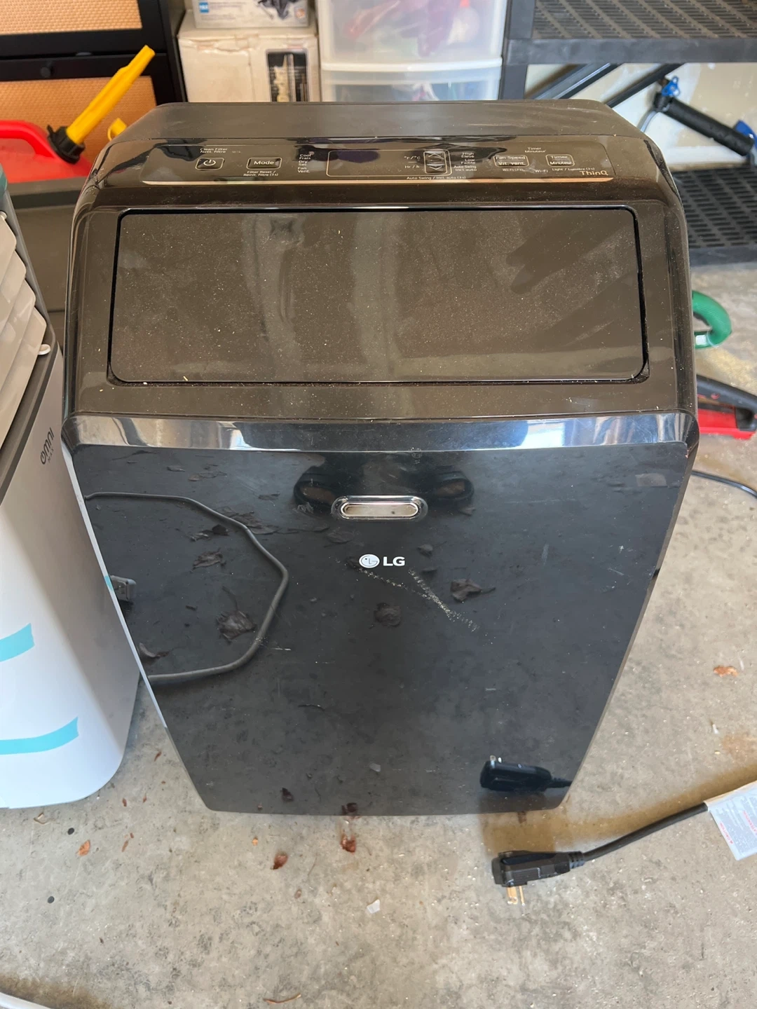 Black LG ThinQ portable air conditioner. It's a 10,000 BTU unit. Includes the power cord. Perfect for cooling a room!