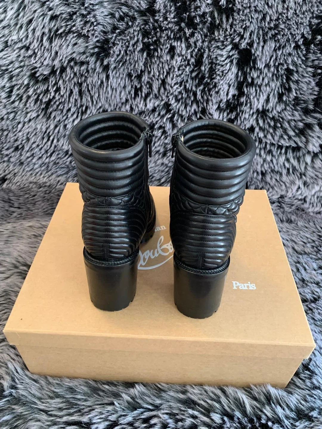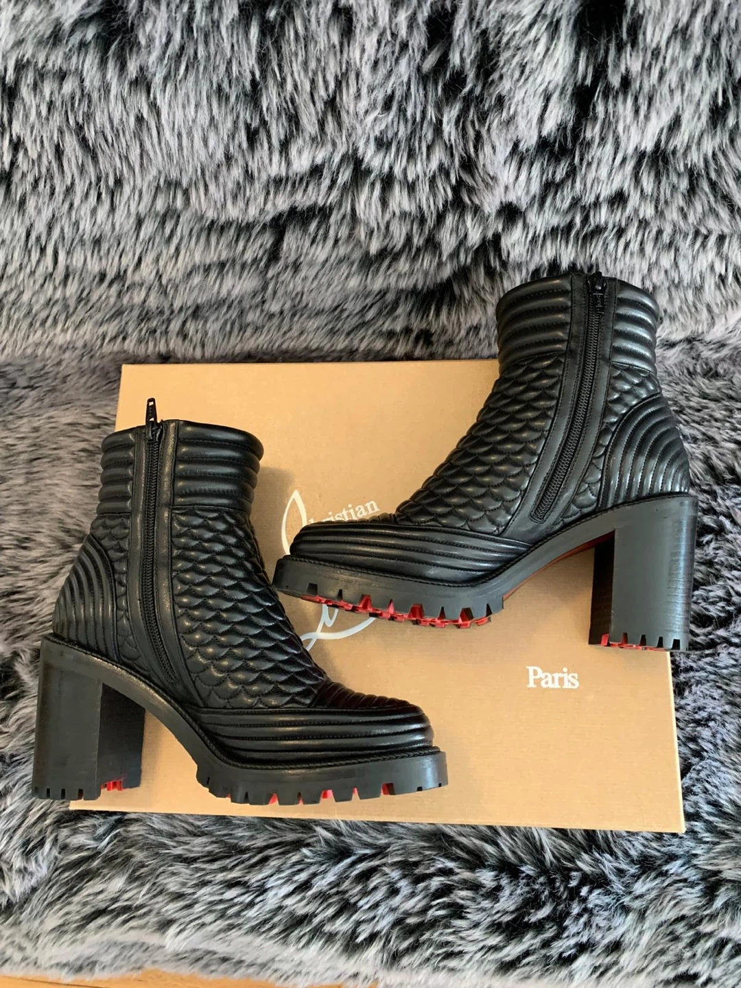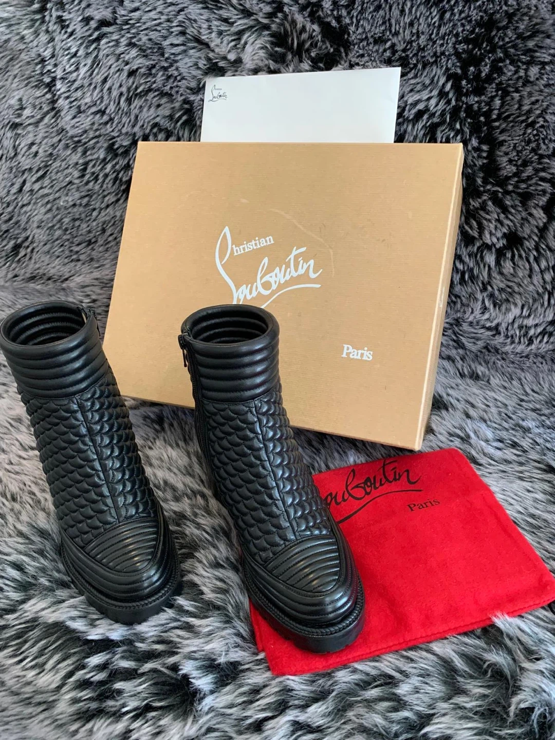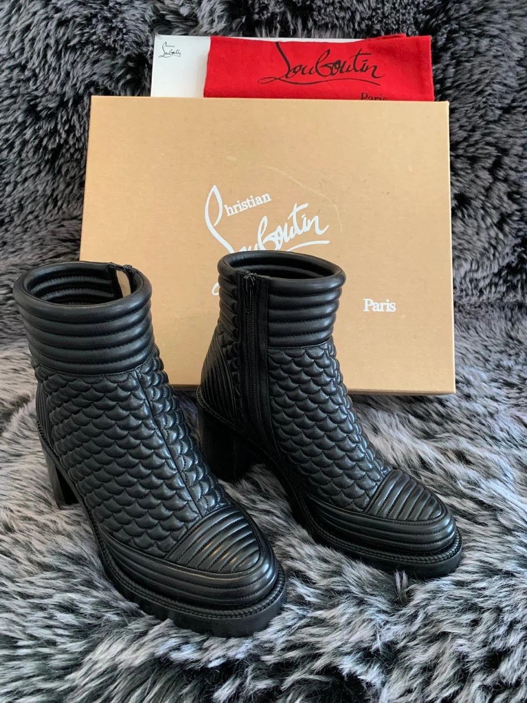 These stunning Christian Louboutin boots are authentic made of black quilted leather with a side zipper. Size 37.5 EUR/ 7.5 US. Only worn twice indoors for couple of hours. Still looks brand new. They come with the original box and dust bag. These boots are a chic addition to any wardrobe! Originally over $1450 plus taxes retail. Serious buyers only. Price is firm.