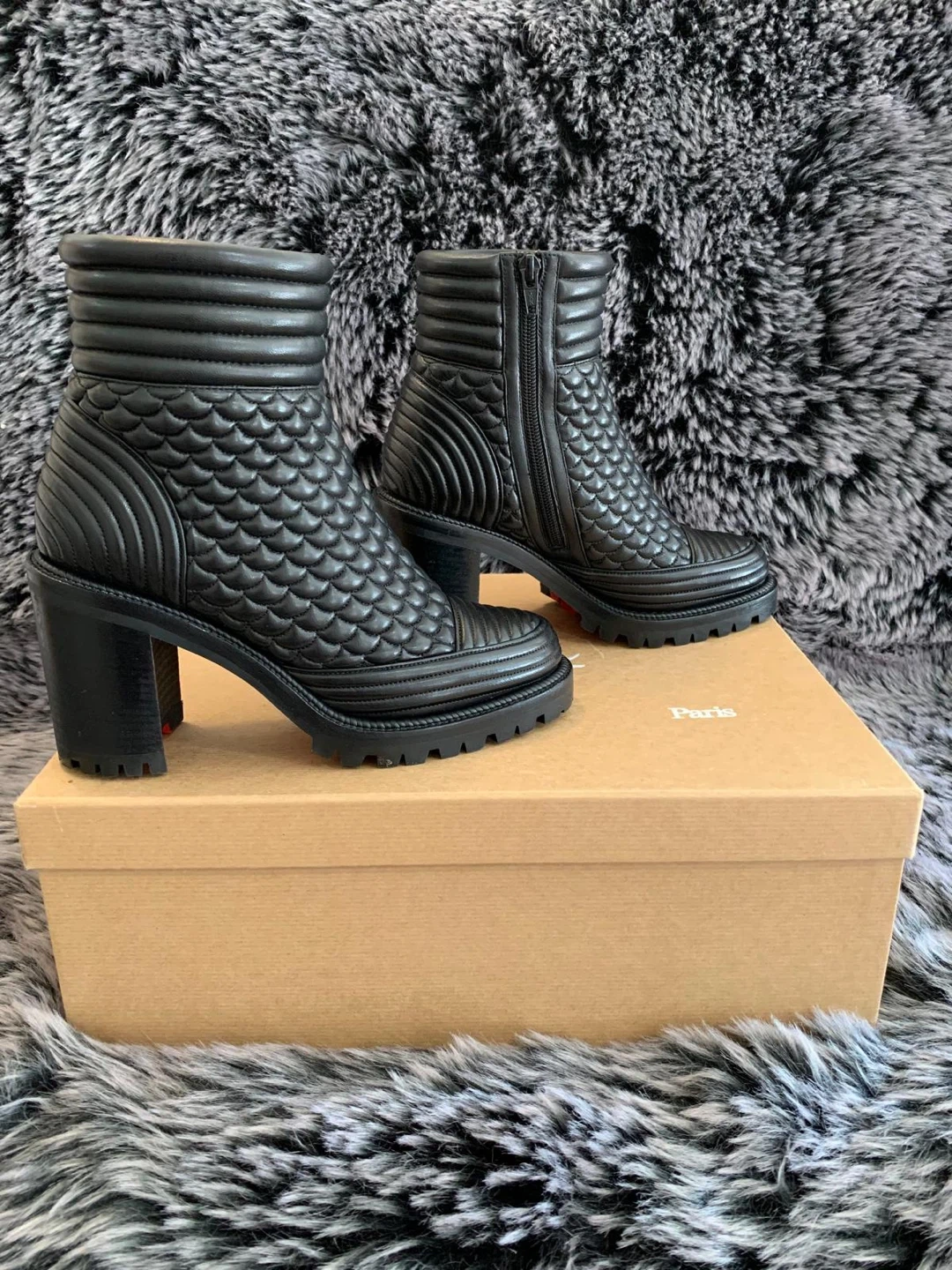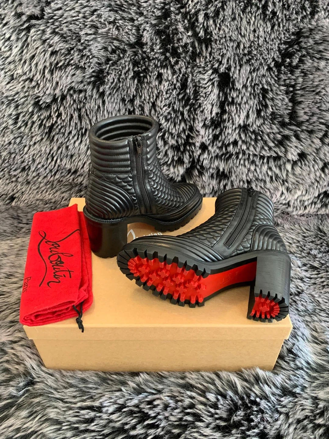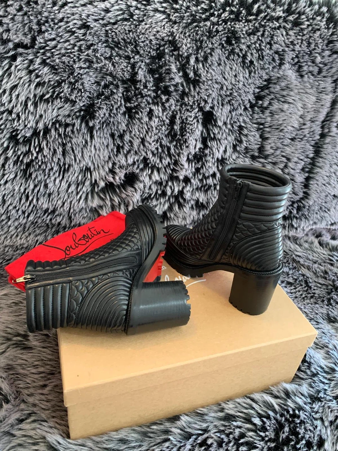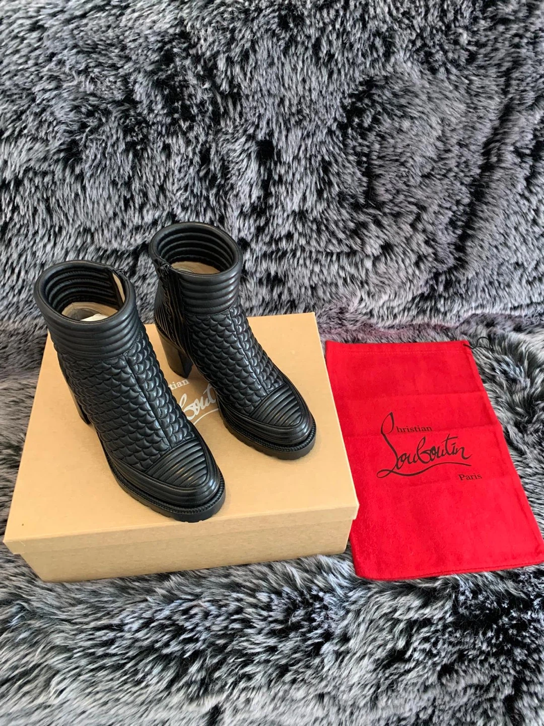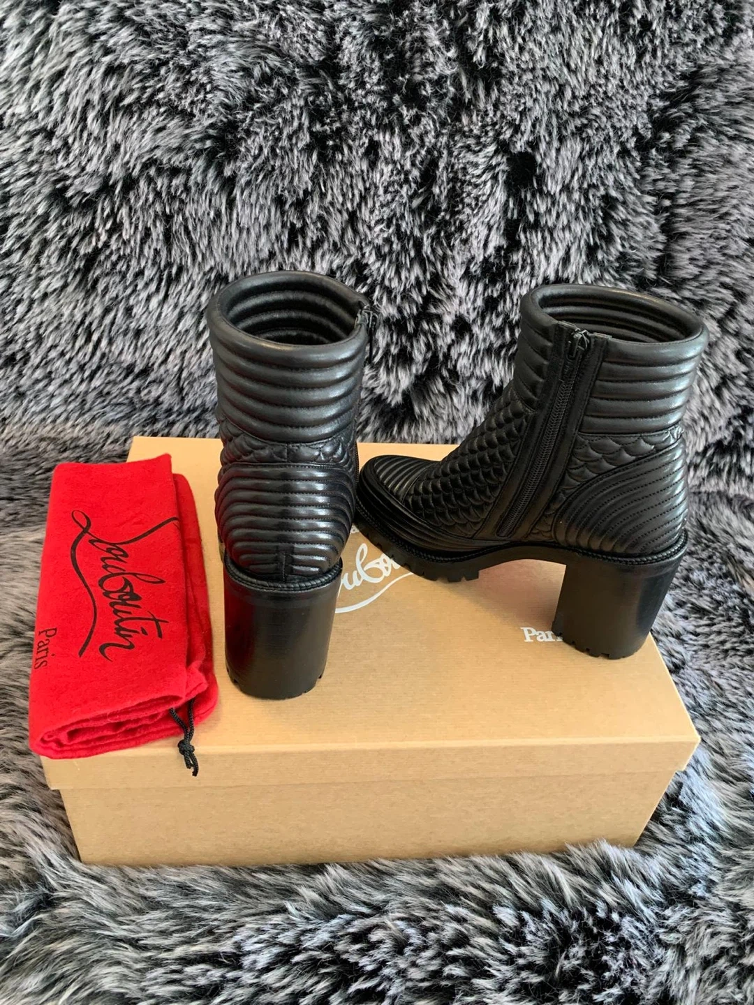 These stunning Christian Louboutin boots are authentic made of black quilted leather with a side zipper. Size 37.5 EUR/ 7.5 US. Only worn twice indoors for couple of hours. Still looks brand new. They come with the original box and dust bag. These boots are a chic addition to any wardrobe! Originally over $1450 plus taxes retail. Serious buyers only. Price is firm.