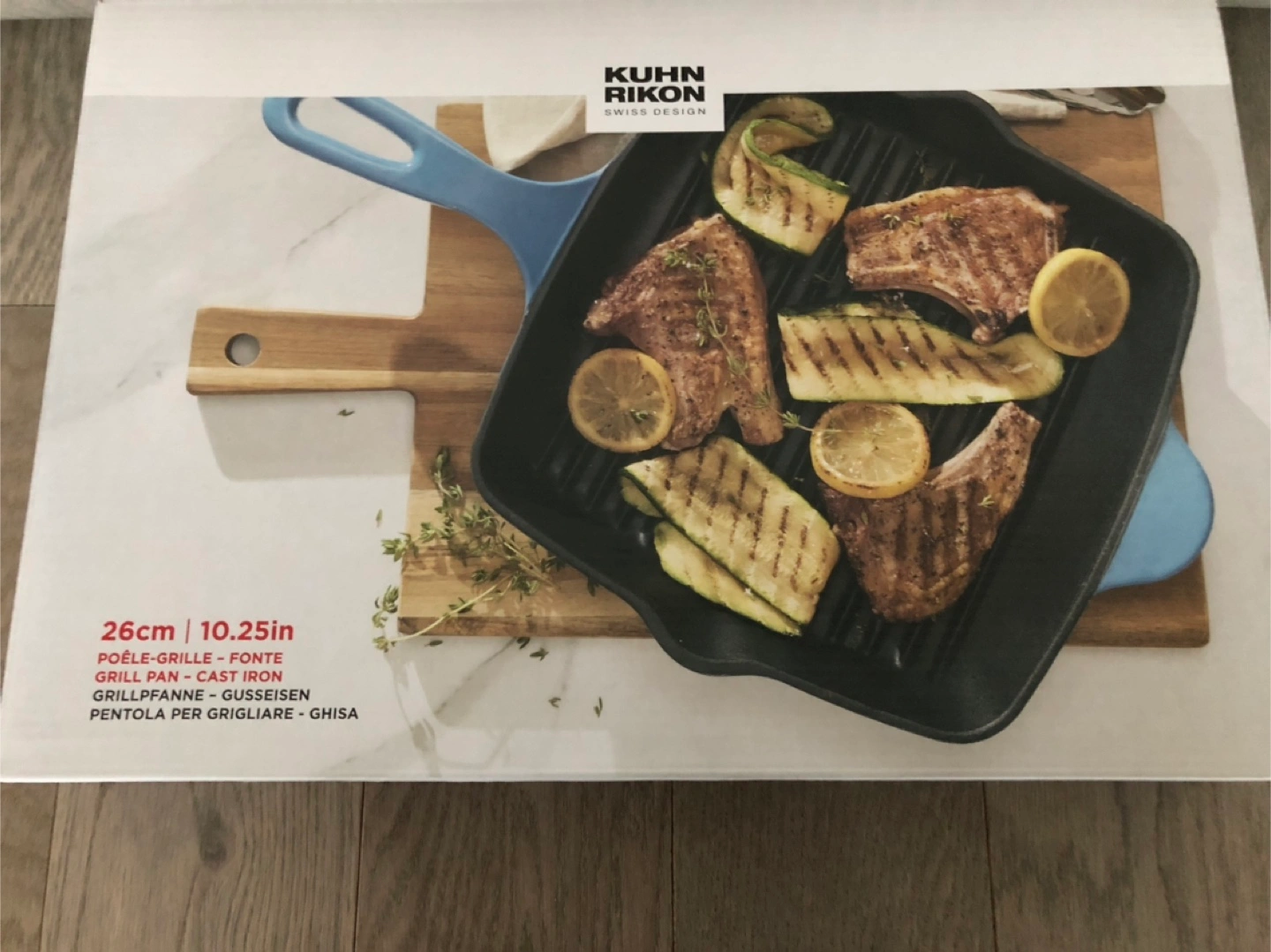 This Kuhn Rikon grill pan is 26cm or 10.25 inches. It's made of cast iron. It's great for grilling meats and vegetables!