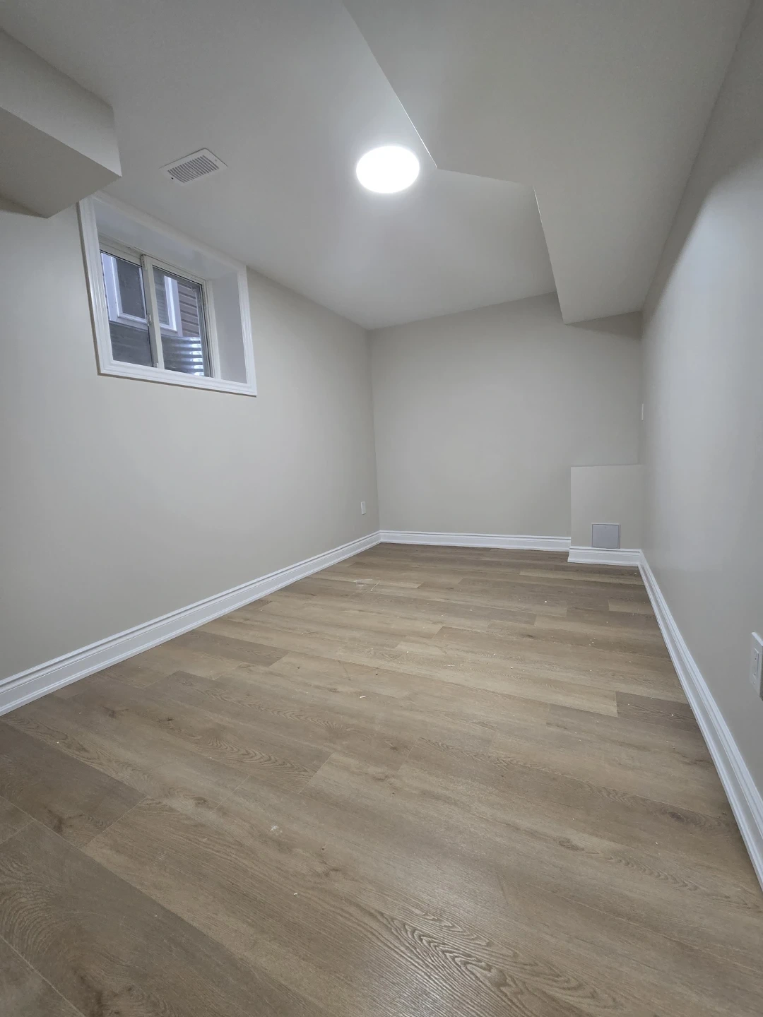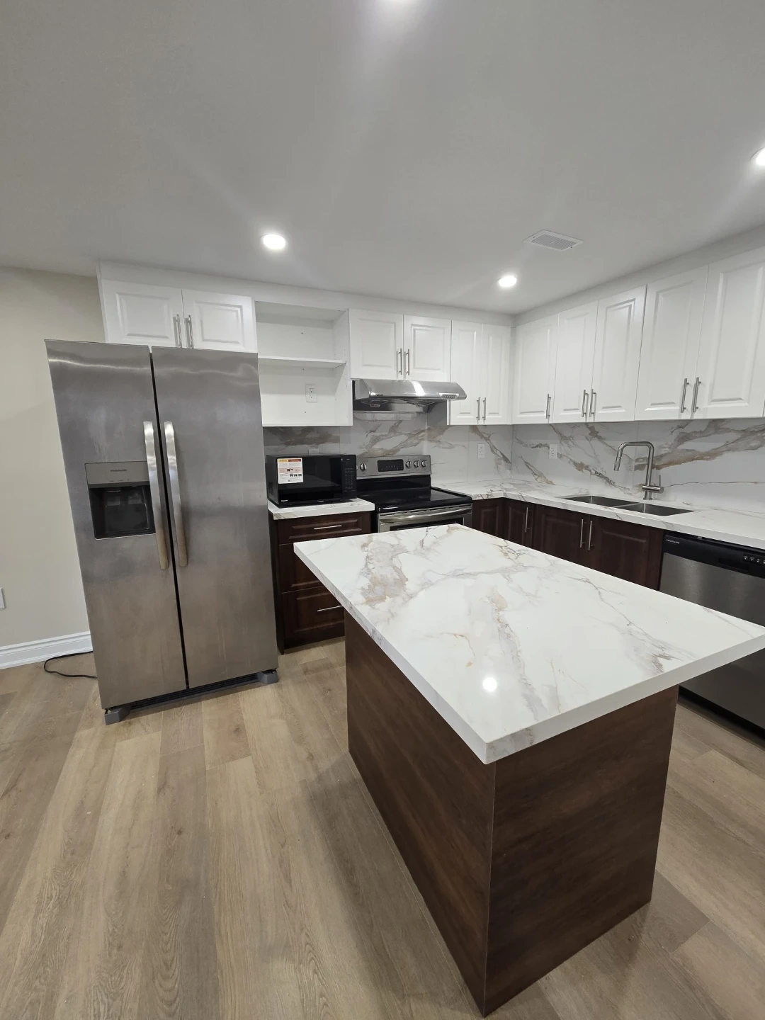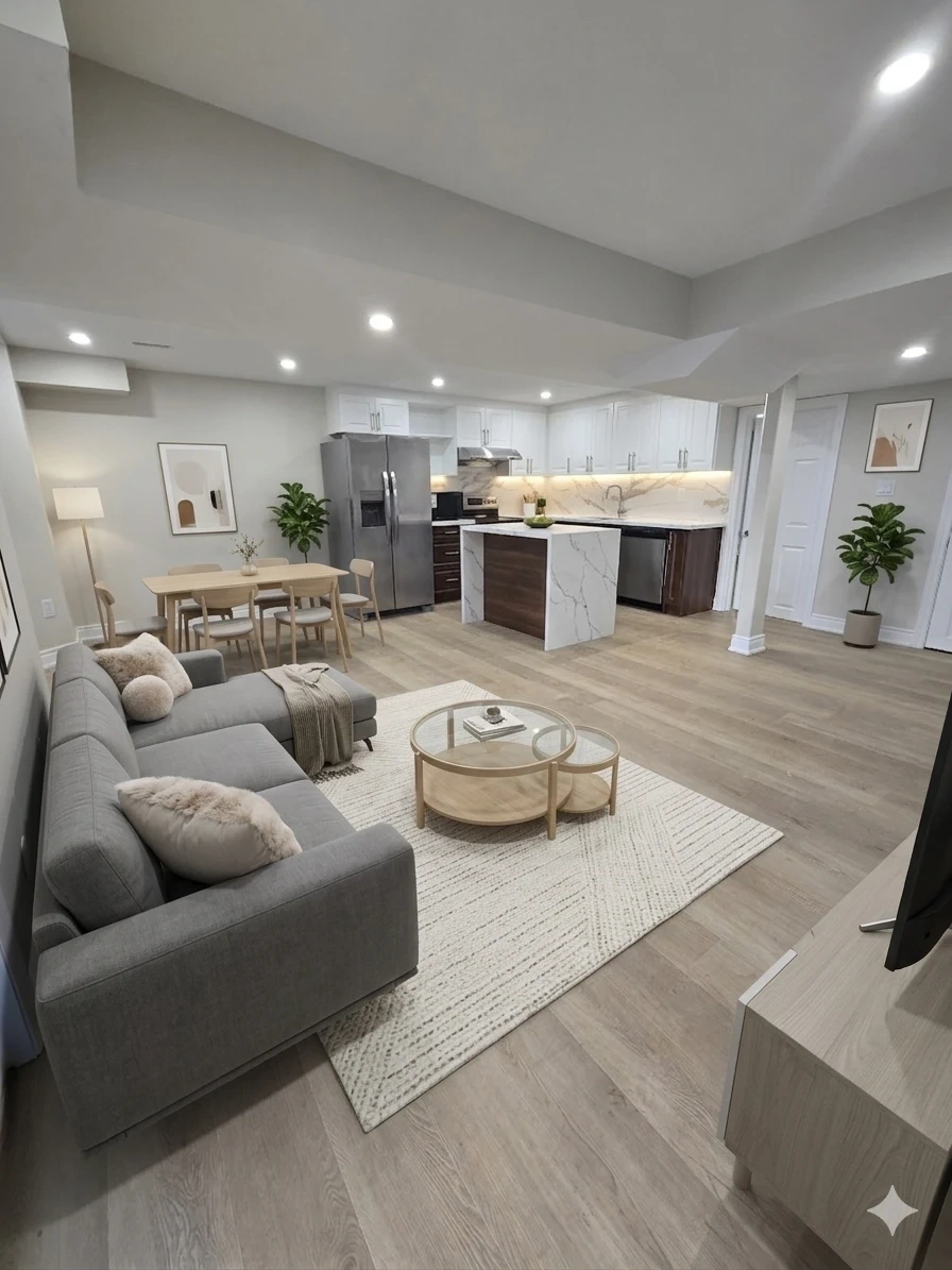 This modern basement apartment features a spacious open-concept layout, perfect for entertaining or relaxing. The kitchen boasts ample cabinet space and a stylish island with a marble-look countertop. Flooring is a light wood laminate throughout. It's ideal for a young professional or a couple seeking a stylish urban living space.