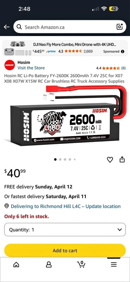 Selling a brand new, never used Hosim RC Li-Po Battery (Model FY-2600K). This is a high-capacity replacement battery perfect for RC cars and trucks. Specifications: Capacity: 2600mAh, Voltage: 7.4V, Discharge Rate: 25C, Compatibility: Designed for Hosim X07, X08, X07W, X15W, and other similar brushless RC cars/trucks. Condition: 10/10 (Brand new in original condition). Price: $30 (Firm). Location: Richmond Hill. Free on-site testing available if you bring your RC car. Selling "As Is". Pick up only.