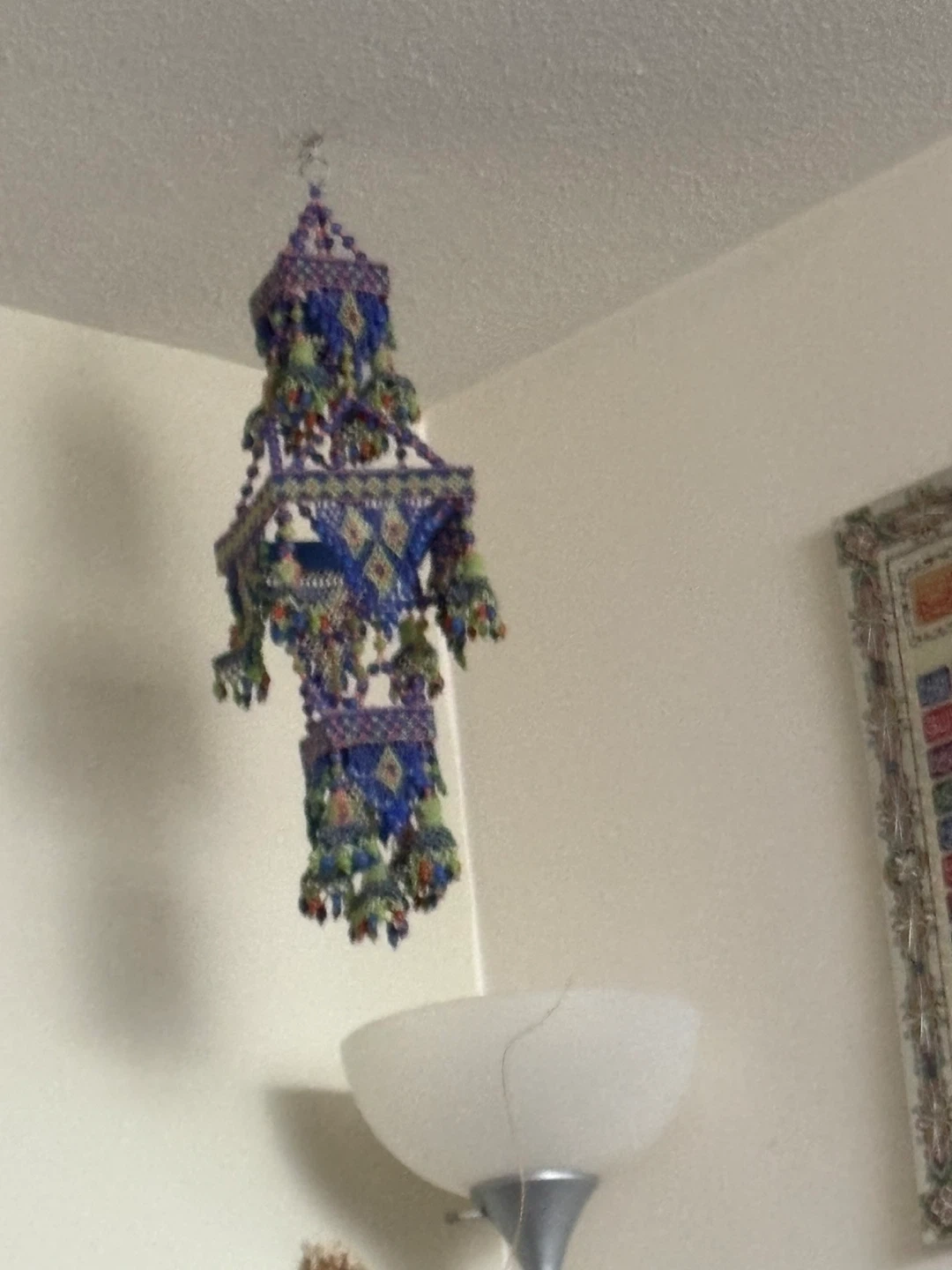 A unique beaded chandelier-style hanging decoration. It features intricate beadwork in blue, green, and other colourful accents. This decorative piece adds a touch of bohemian flair to any room!