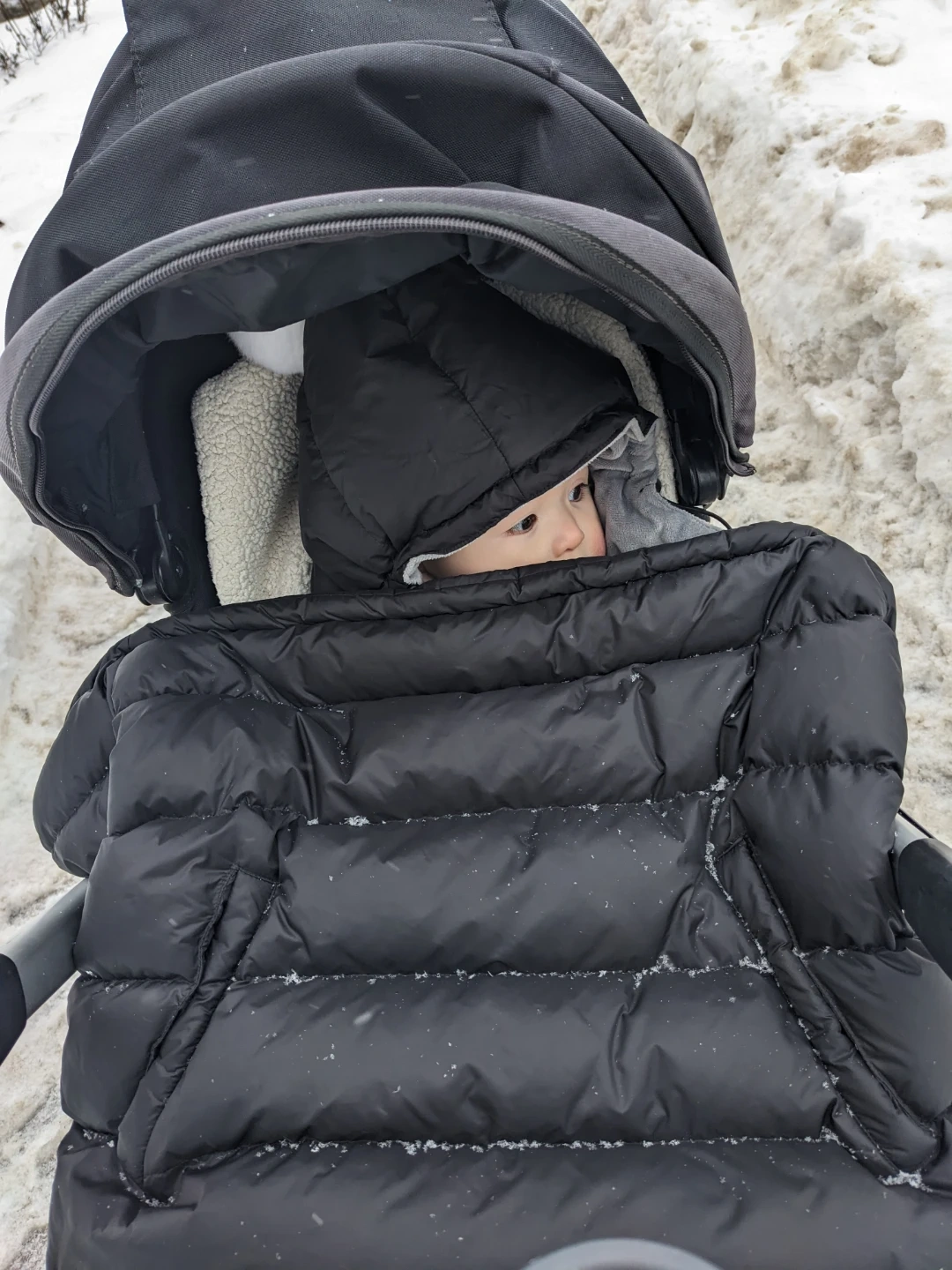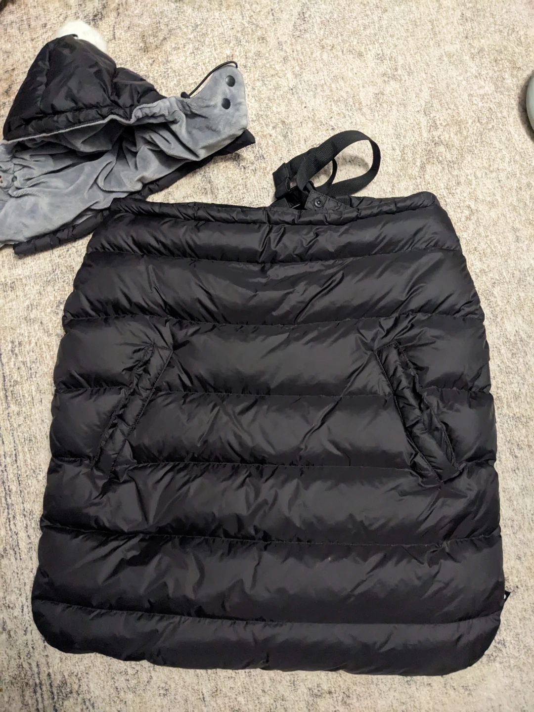 Keep your little one warm and cozy with this black goose down winter cover. It's made with a goose down and a soft, grey fleece lining. Includes a hood for extra warmth.