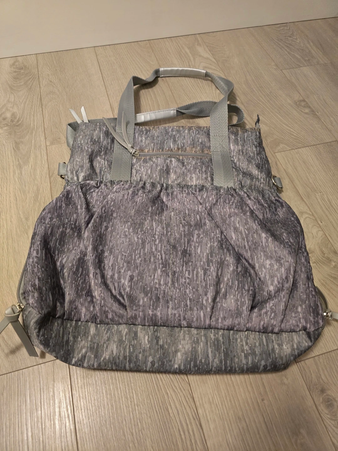 This tote bag features a unique grey and purple abstract print. It has two sturdy grey shoulder straps and a zippered top closure. Comes with a front zippered pocket, and zippers at either side so you can easily carry your yoga/pilates mat.