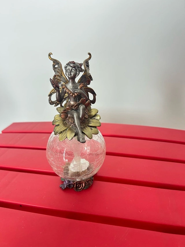 Made of metal and glass. A bit heavy. Lights up, flashes different colors. Requires 2 button batteries, not included. Beautiful to watch at night, quite pretty. Please message to arrange viewing and/or pickup. Pickup in Kanata, near Moodie Dr & Queensway.