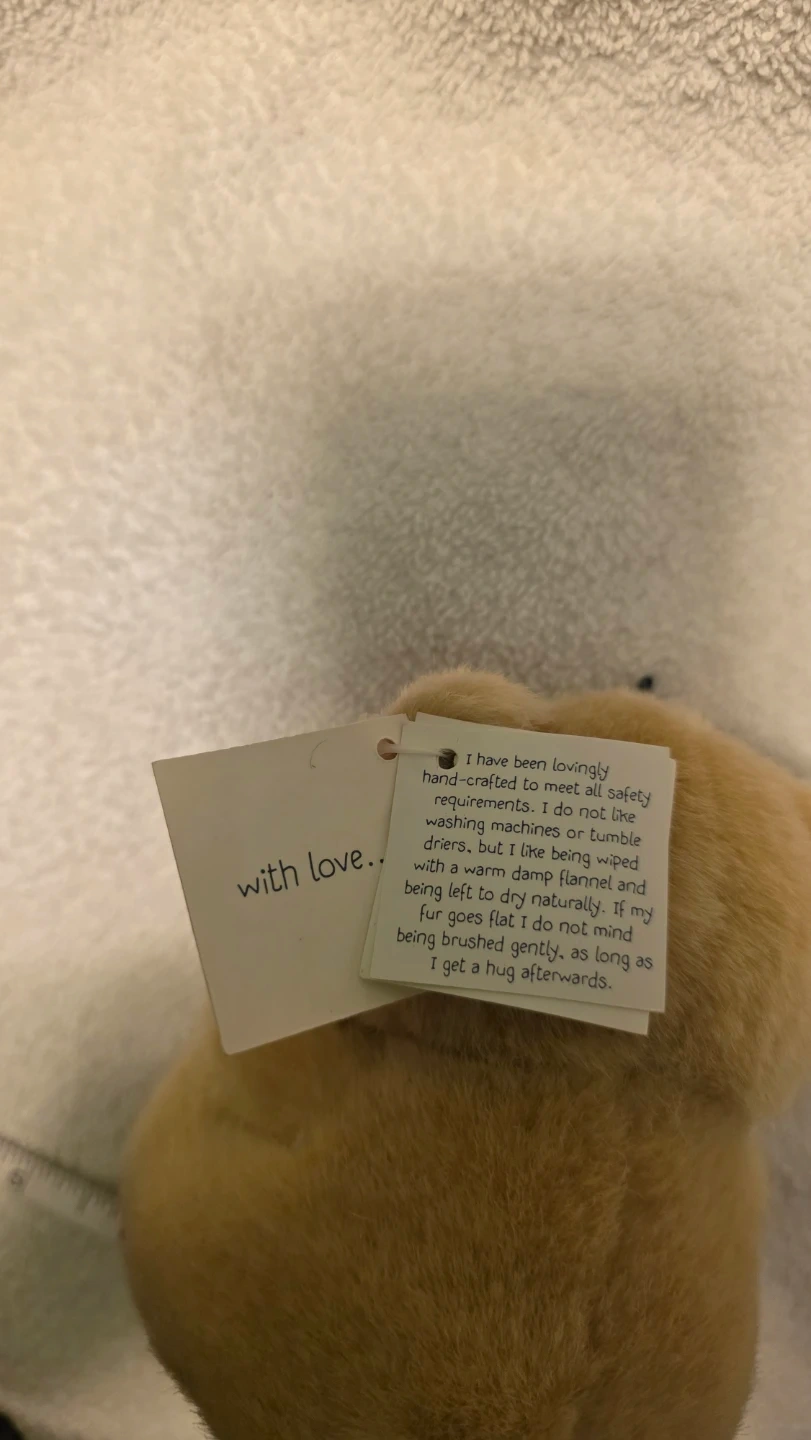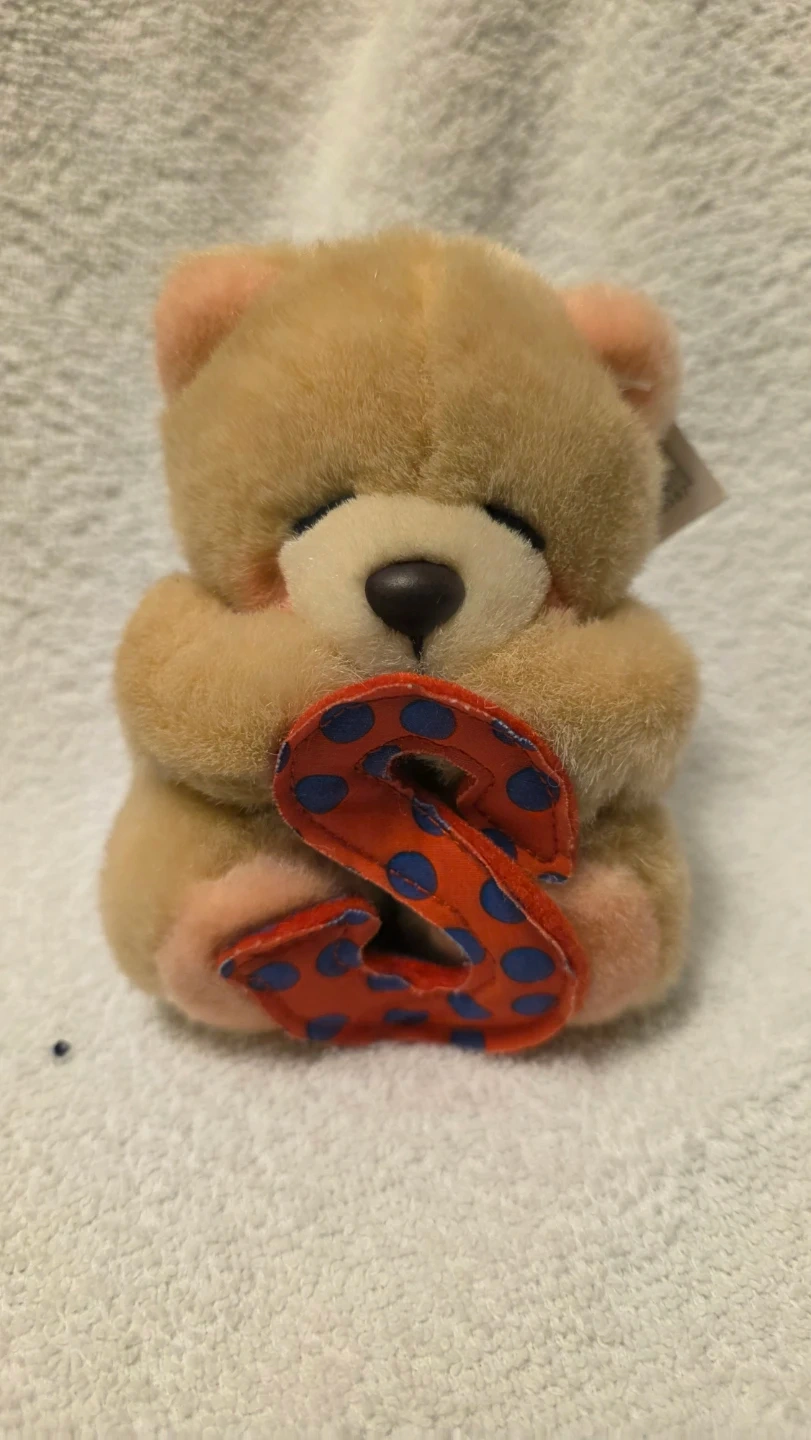 This is a cute teddy bear from the Forever Friends collection. It's holding an orange "S" with blue polka dots. It's handcrafted to meet safety requirements and is surface washable. This plush would make a nice gift for a child or collector!