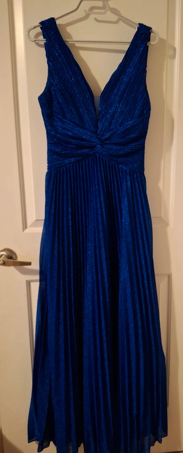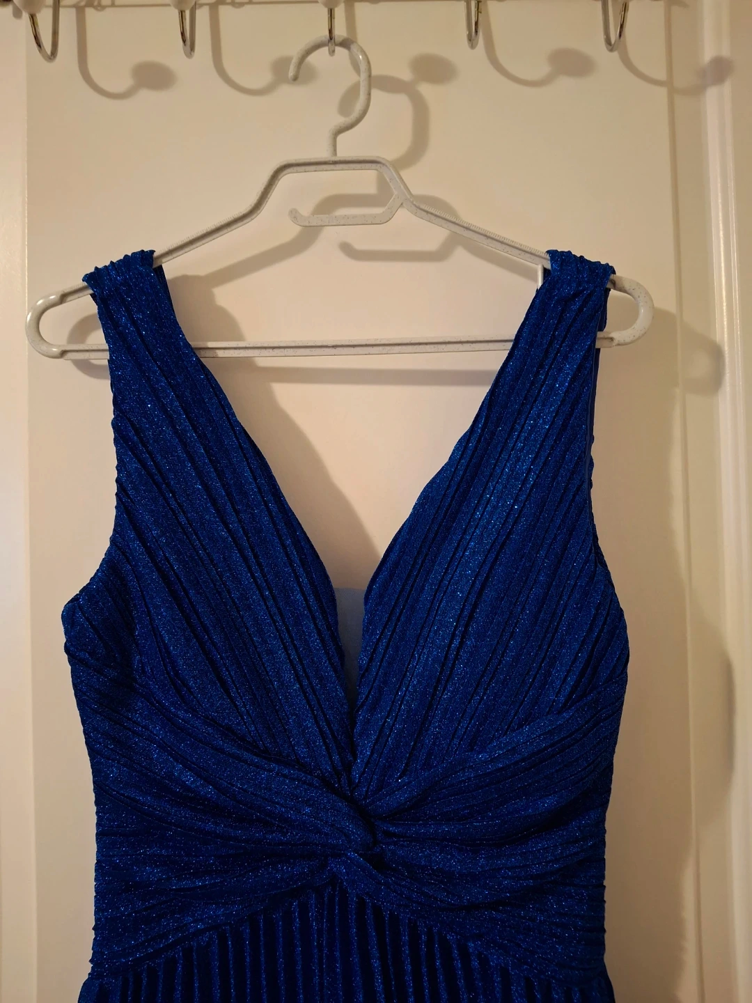 This eye-catching blue gown features a sparkly, metallic finish and a flattering V-neckline with a twisted front detail. It has a sleeveless design and a flowing, pleated skirt. This dress is perfect for special occasions and evening events!