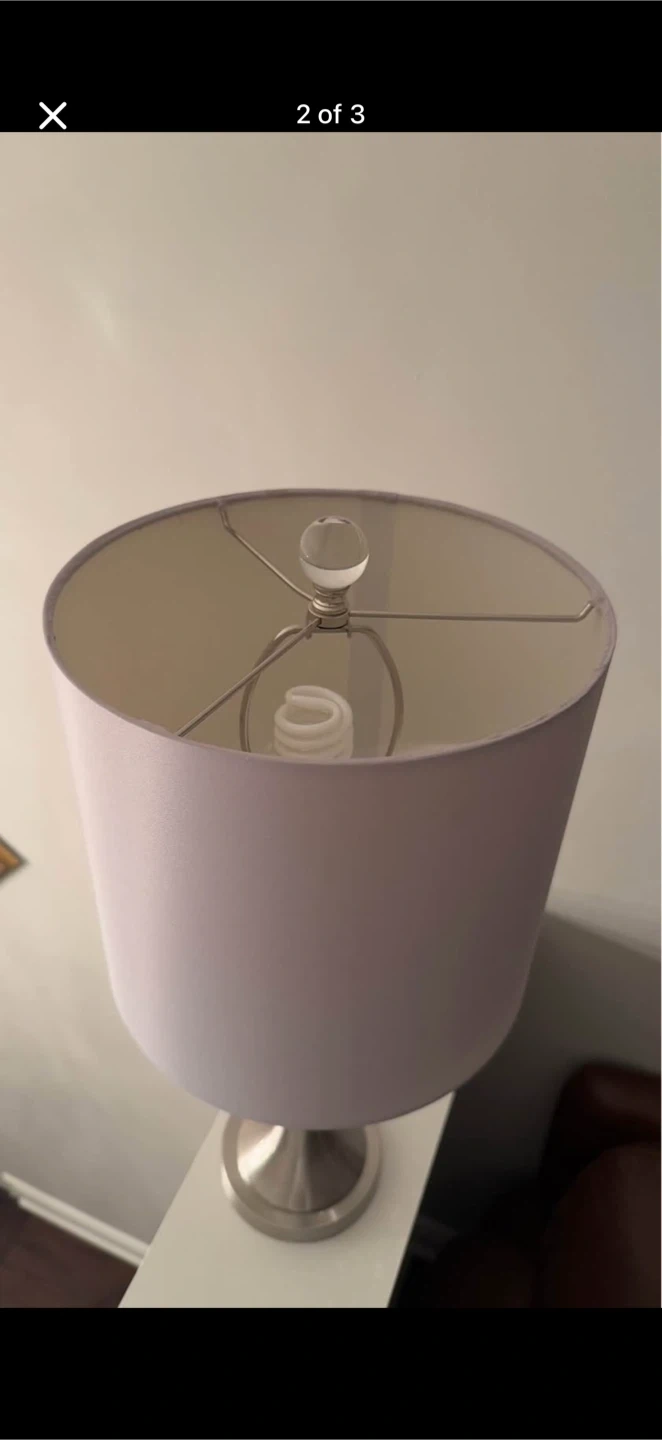 A lovely table lamp with a silver metal base and crystal accents. It has a light purple fabric shade and a spiral CFL bulb is included. It's perfect for adding a touch of style to any room!