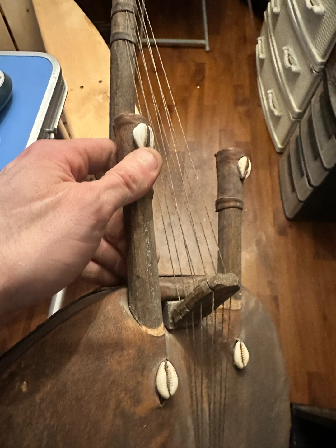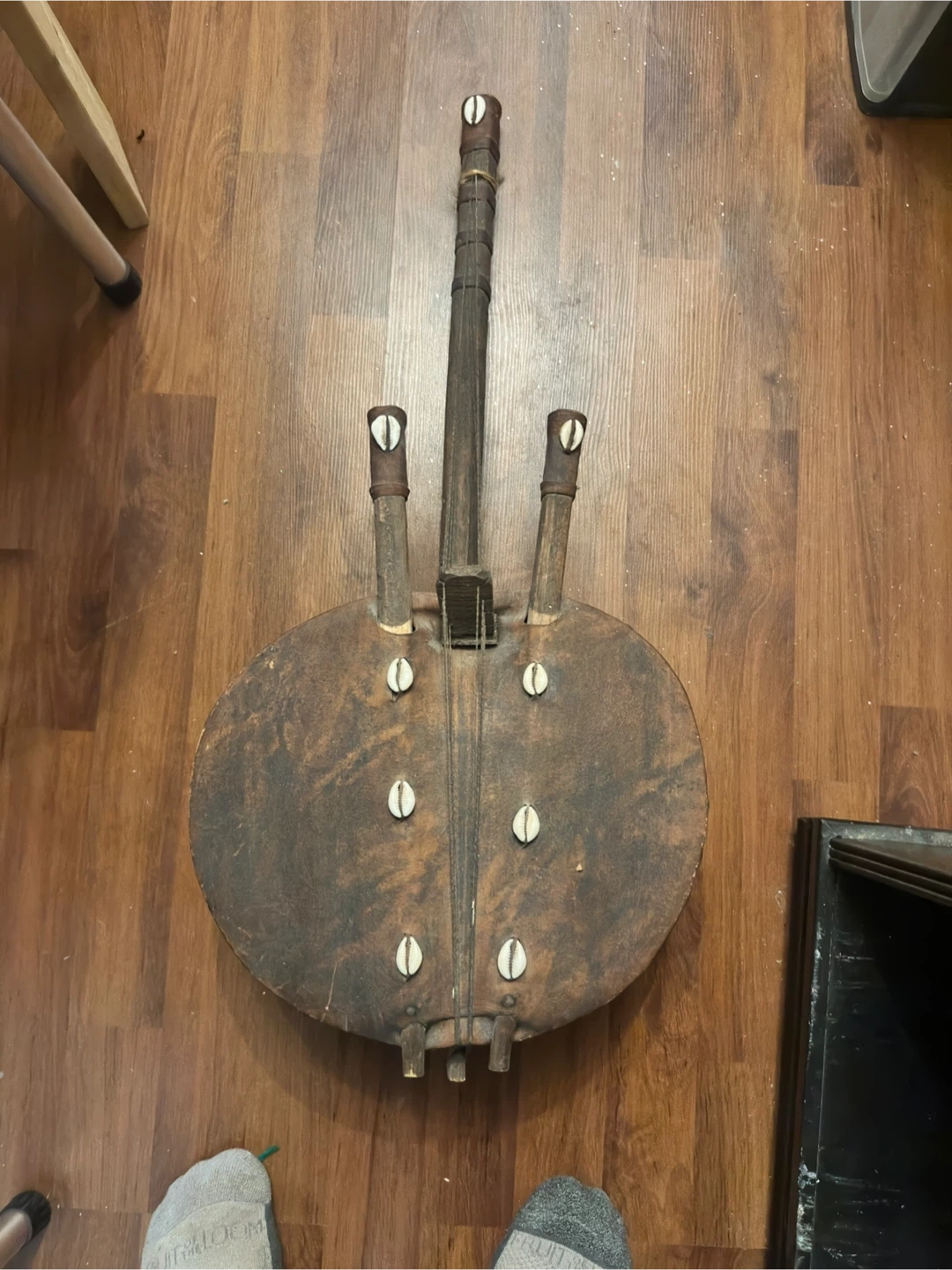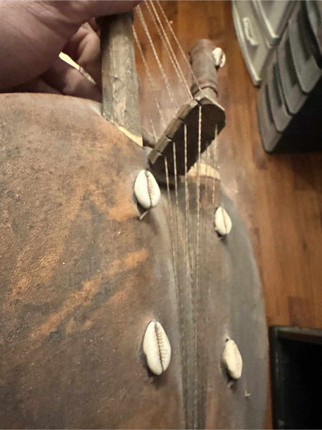 This is a vintage Kora, a traditional West African stringed instrument. It's made of wood and features decorative cowrie shells. This instrument has a unique sound and cultural significance.