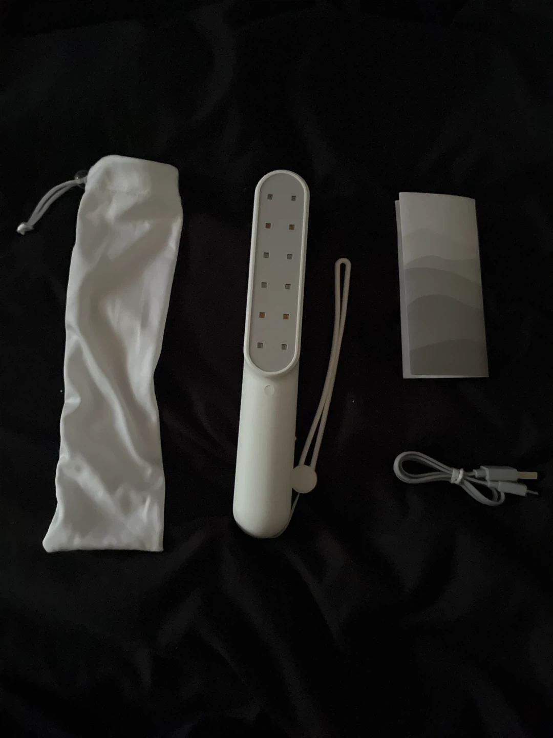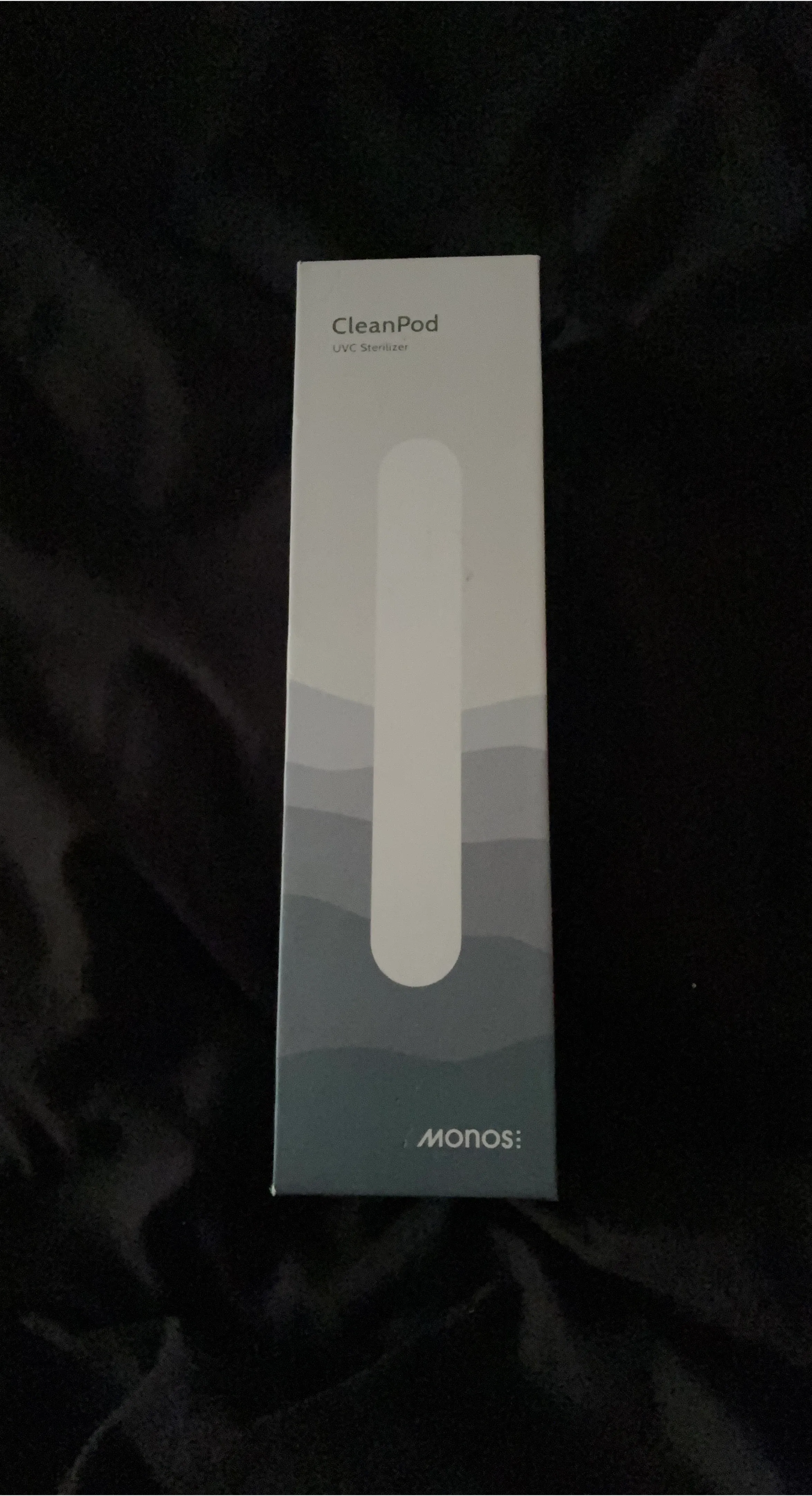 This is the Monos CleanPod UVC sterilizer. This device uses UVC light to sanitize surfaces and items. Comes with a storage pouch, USB charging cable, and instructions. Never used before.