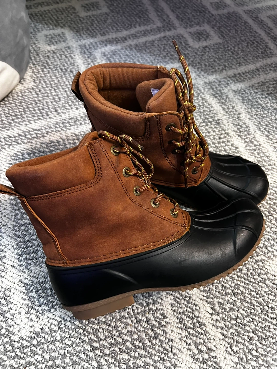 Selling a pair of duck boots! They're in great condition and ready for the fall and winter weather. The boots are brown with black rubber soles and have gold and brown laces