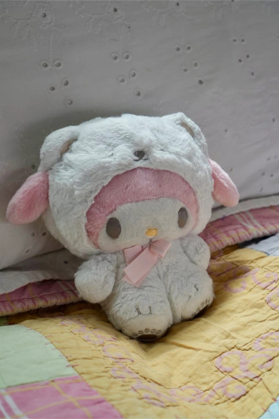 A cute My Melody plush toy is up for grabs! It's in great condition, ready to bring joy to its new owner. This soft and cuddly plush is perfect for fans of My Melody or anyone who loves adorable stuffed animals